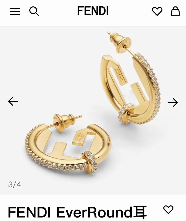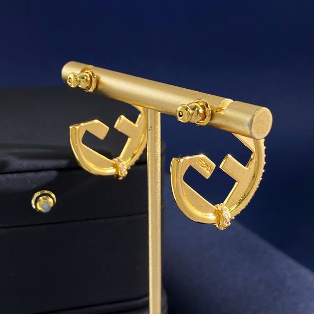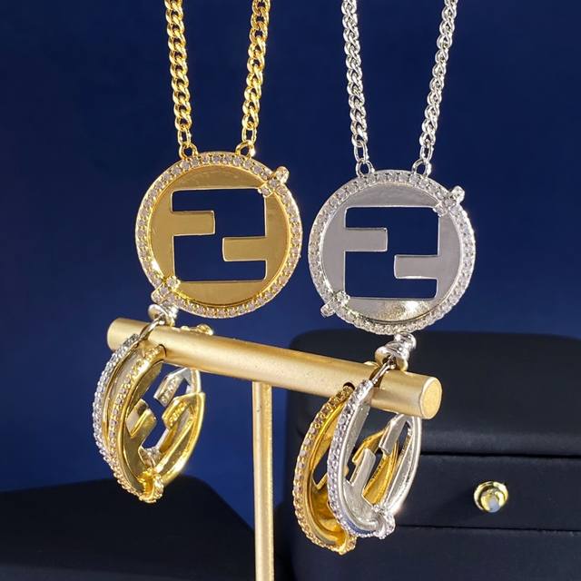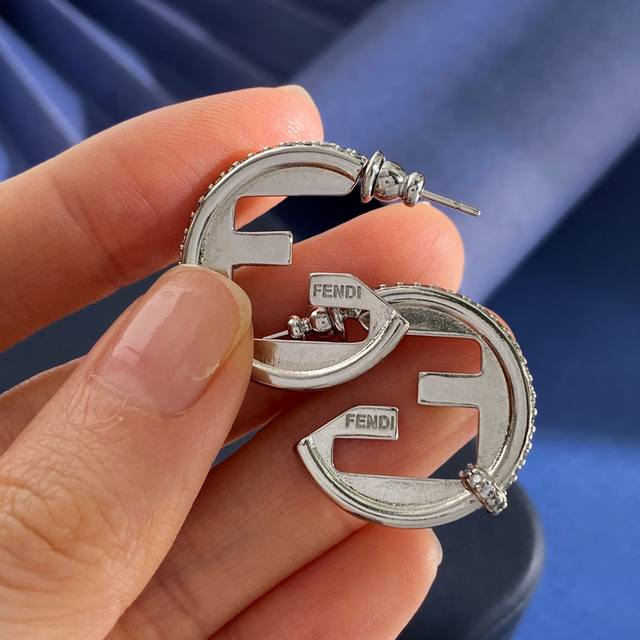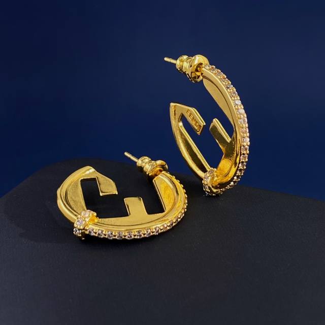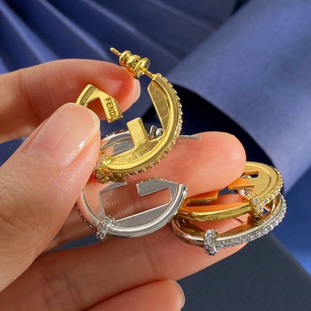 Fendi European and American style fashionable high-end geometric round earrings with diamond side setting and double F letter studs, made of brass, available in gold and silver, weighing approximately 6.9g, measuring 2.5cm*2.3cm*0.5cm.