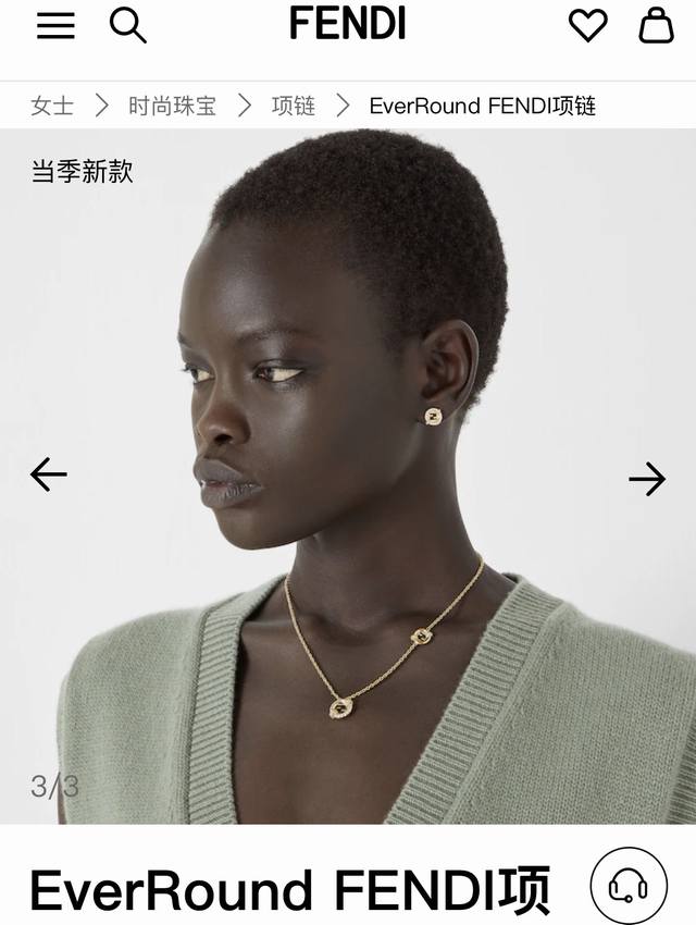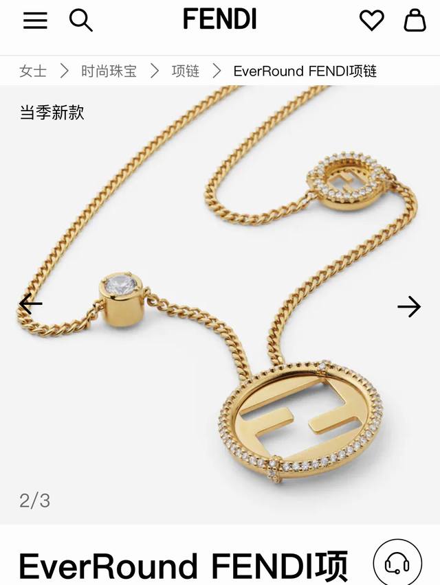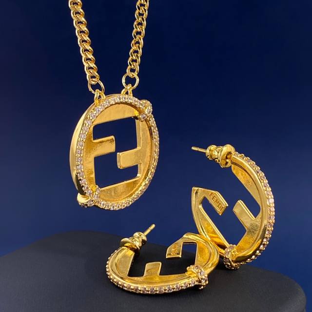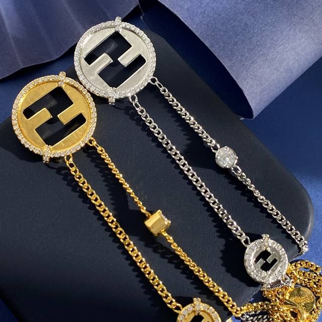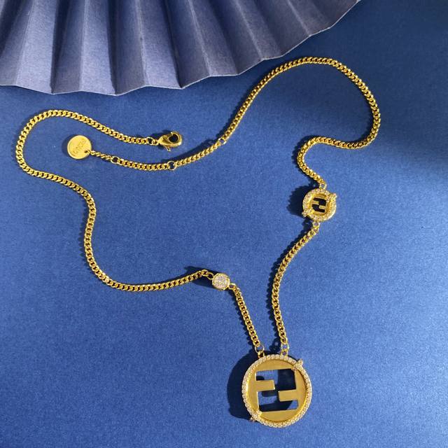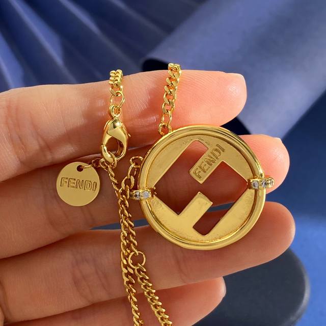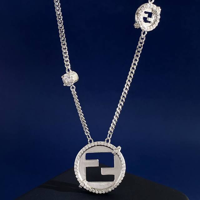 Fendi European and American style fashionable high-end geometric round ring diamond double F letter disc pendant necklace, brass material, gold and silver two colors, weight approx. 16.6G