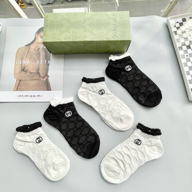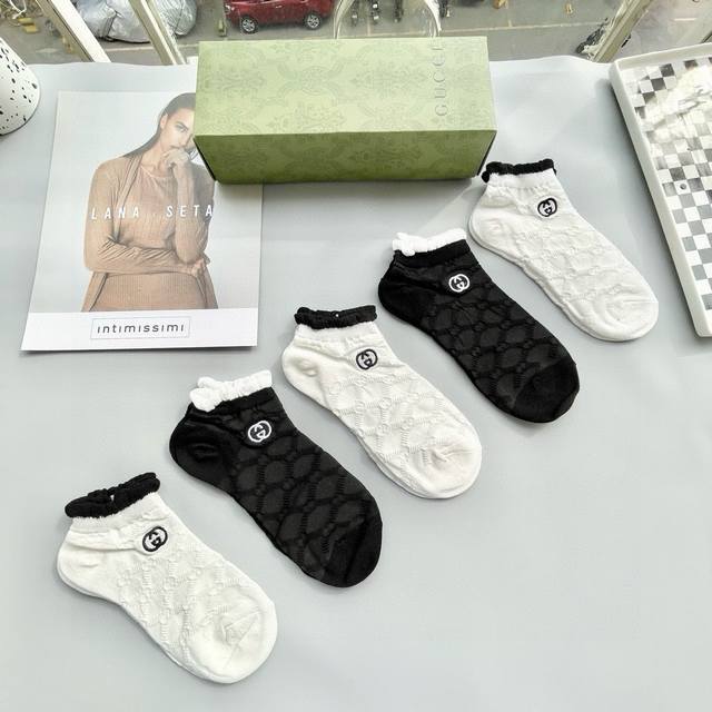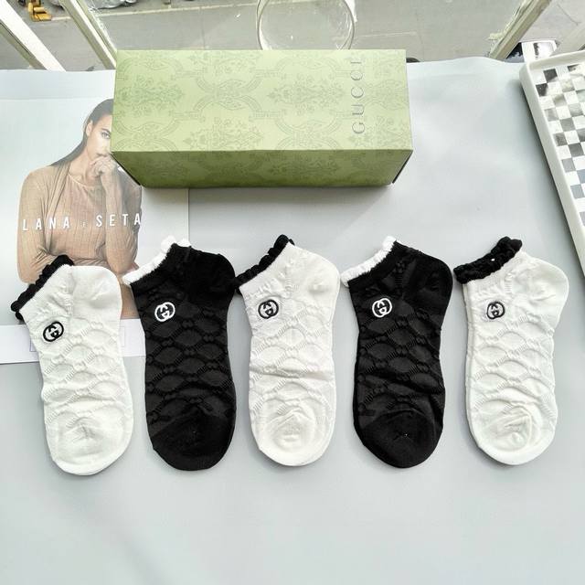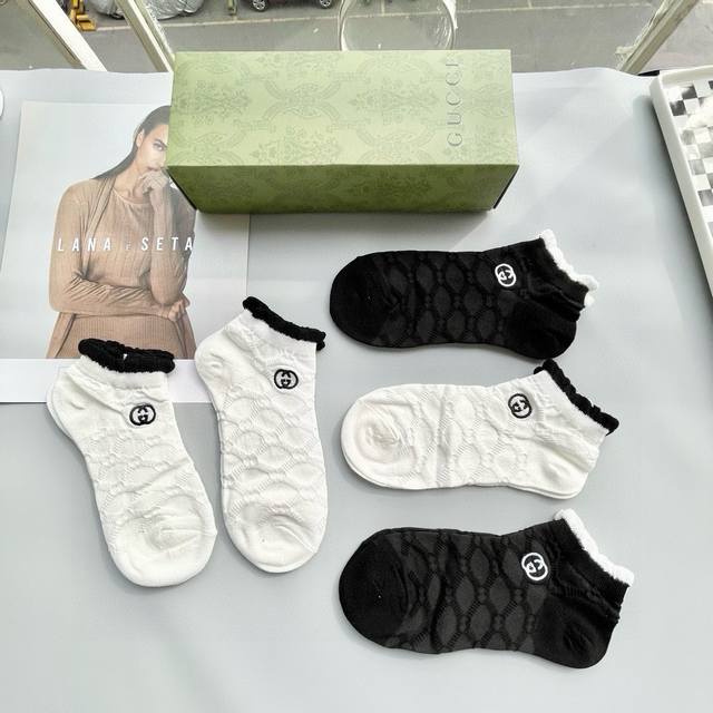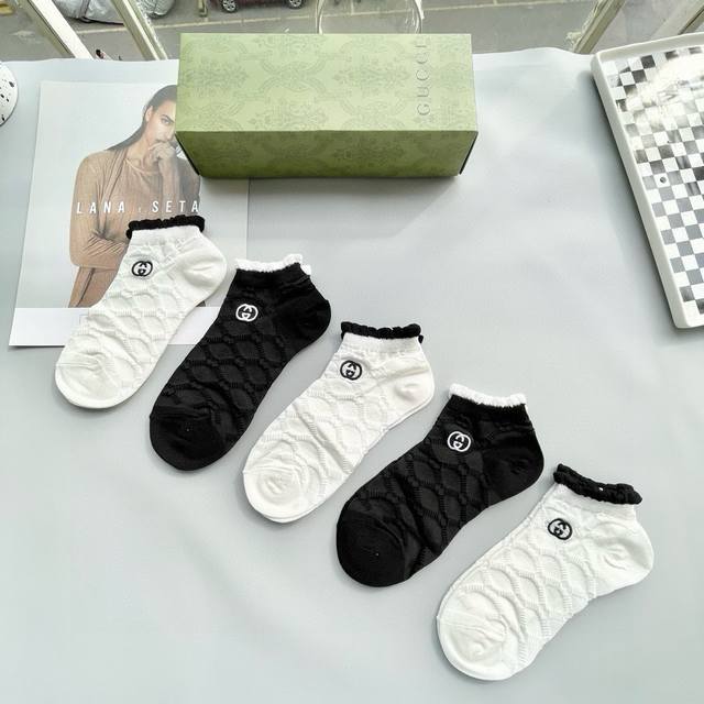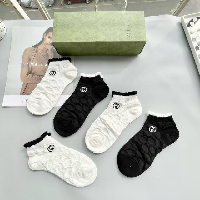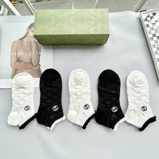 Comes with a box of five pairs of Gucci socks. They are so beautiful! European and American brand short socks are a must-have for fashionistas. They are super stylish and fashionable when paired together. Recommended! A must- have fashionable item!