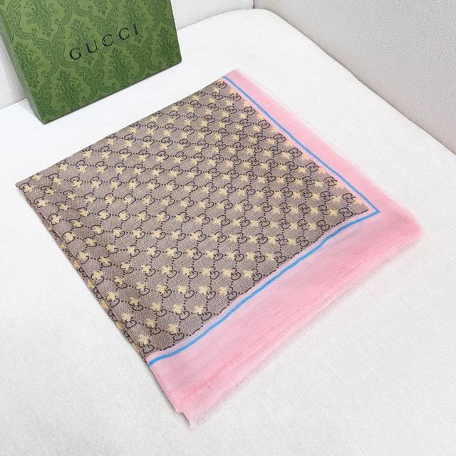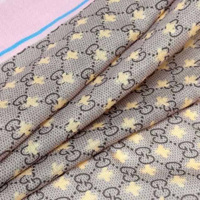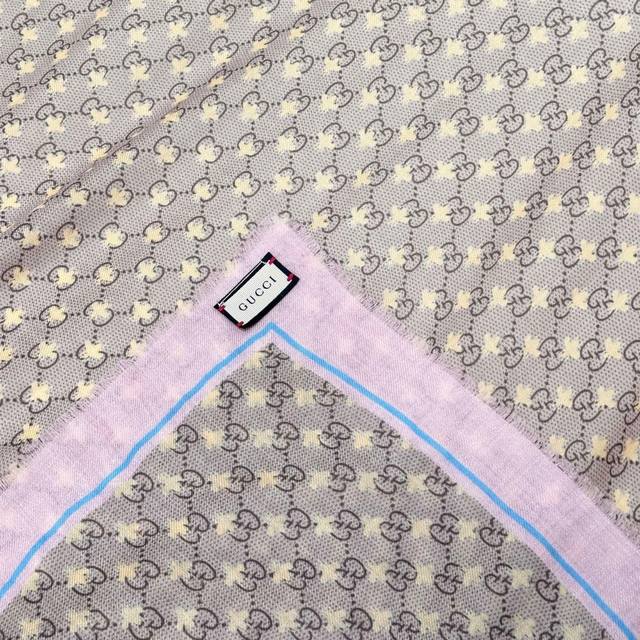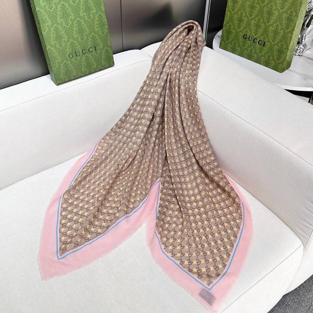 Gg Horsebit Cashmere Handkerchief 140cm. This cashmere handkerchief features the classic Gg pattern paired with a yellow horsebit print and solid-color trim, exuding a sophisticated and elegant style. The Gg pattern pays homage to the extraordinary experiences of the brand's founder, Guccio Gucci, while the horsebit motif highlights the brand's equestrian heritage. Beige and ebony Gg print, adorned with an overprinted, laminated yellow horsebit print. 100% cashmere. 140*140cm.