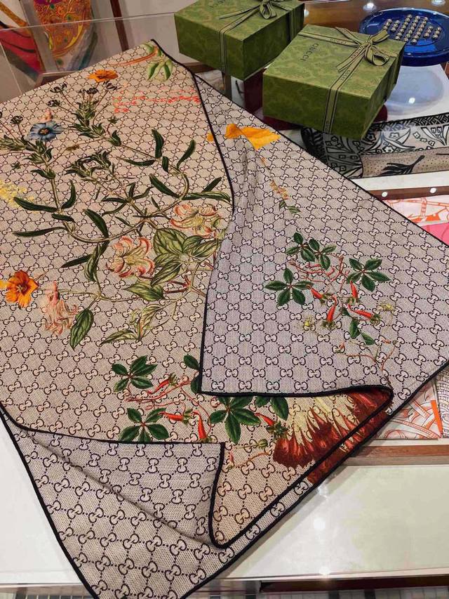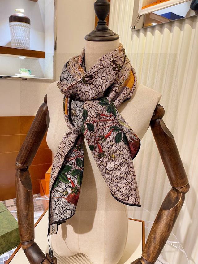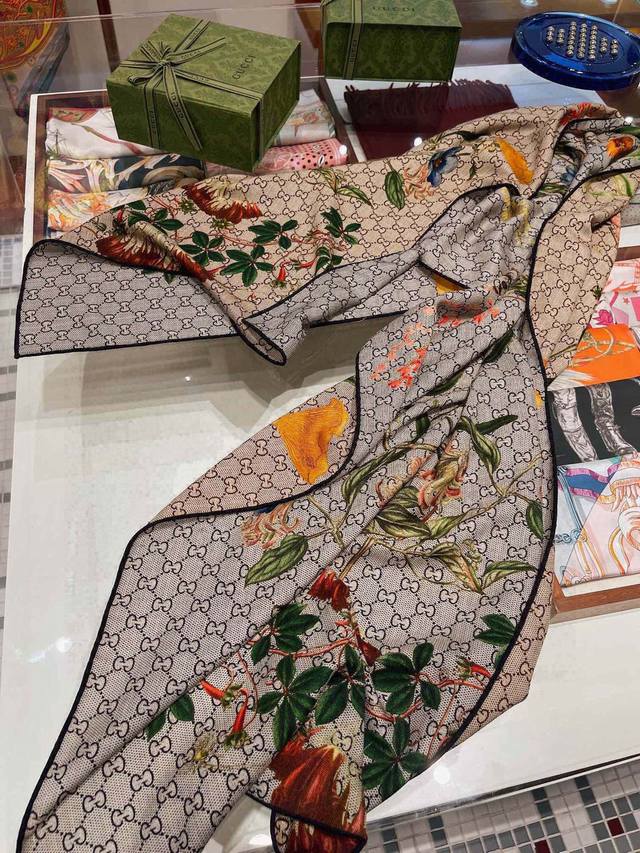 Gucci Double-Sided Two-Tone Floral Cashmere Scarf ~ Super flattering! Sophisticated and feminine! Cashmere scarves can be this beautiful!!! This Gucci double-sided floral cashmere scarf is truly luxurious! The signature floral pattern complements outfits perfectly! A new fusion of Gucci's signature floral elements and the classic Gucci monogram, it exudes luxury and elegance. The thin cashmere feels wonderful, and the double-sided, two-tone design is truly amazing! Perfect for spring and summer with a white shirt, it's both stylish and chic. In autumn and winter, it pairs exceptionally well with a coat. A must-have for fashion-savvy ladies !! Soft, smooth, and supple! This scarf is incredibly easy to style. A very luxurious design, yet it brings out a uniquely elegant and sophisticated aura! Pair this scarf with a simple base layer for a comfortable and tasteful high-end look. Highly recommended !! Size: 60*180cm double-sided, two-tone printed cashmere long scarf, one