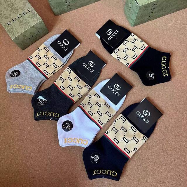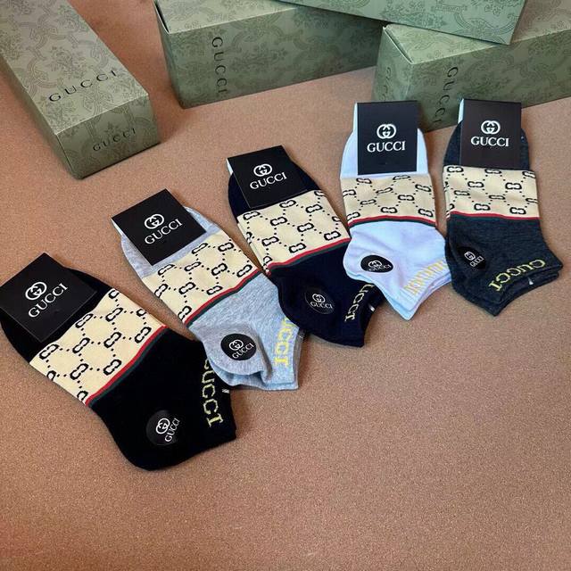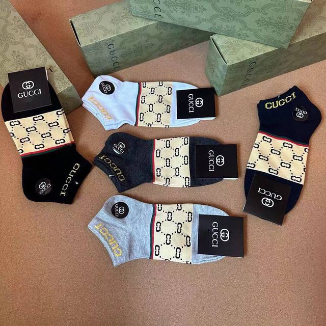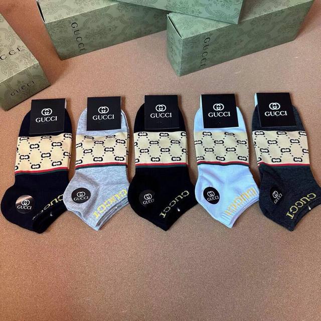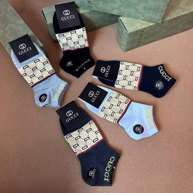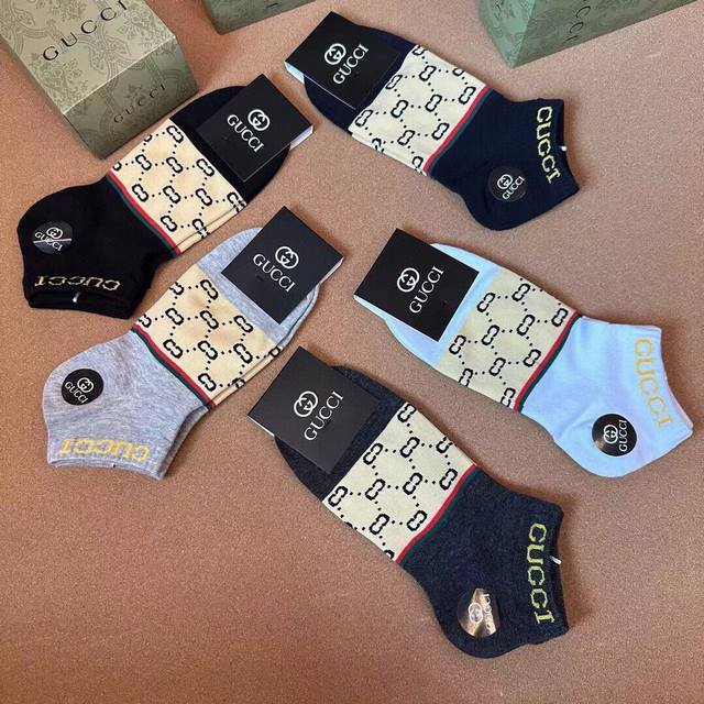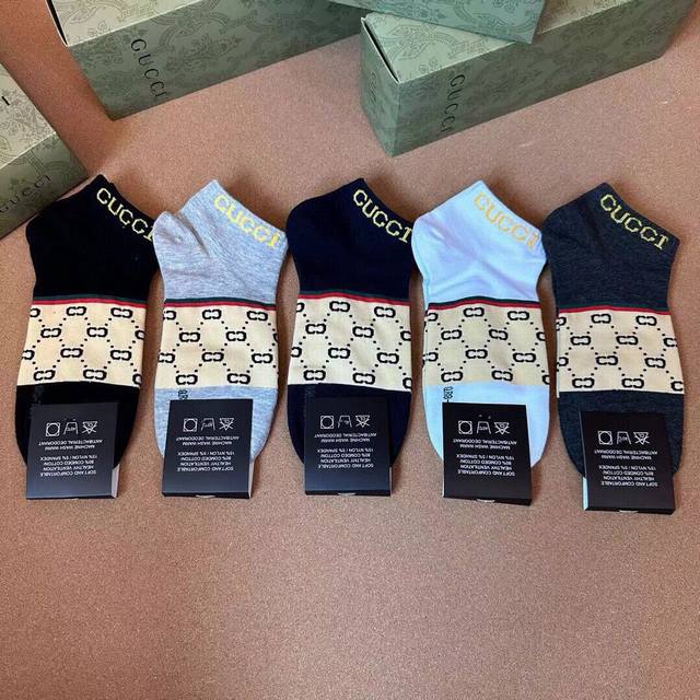 Gucci Men's New Arrival Socks (5 pairs per box), same style as in Gucci boutiques, classic jacquard logo, super nice, looks amazing in person, a super popular item, a must-have for trendsetters, super easy to match.
