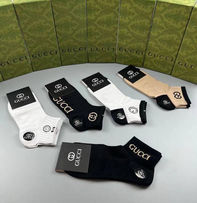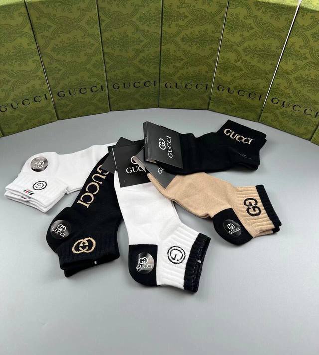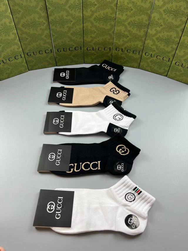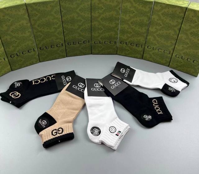 Gucci new arrival short socks, box of five, jacquard classic logo, super nice, looks amazing in person, super popular small item, designer look, a must-have for trendsetters, super easy to match.