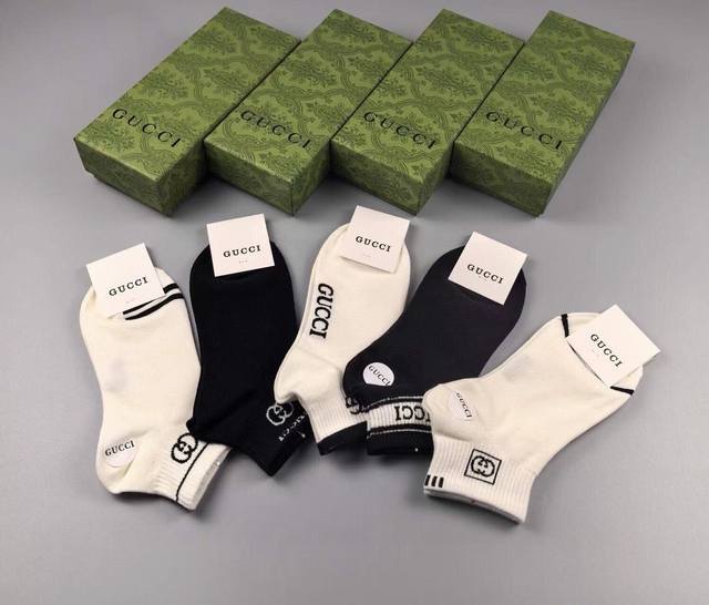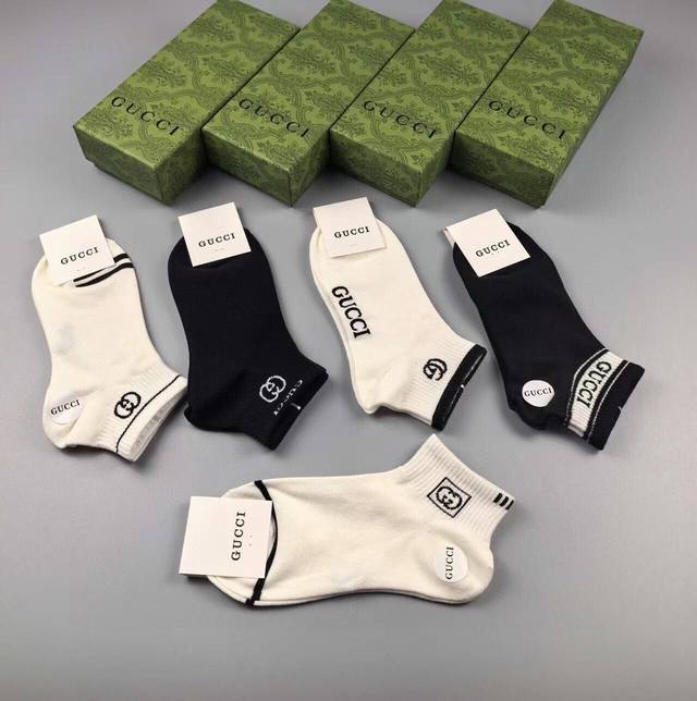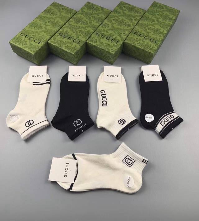 Gucci new arrival short socks, five pairs per box, jacquard classic logo, super nice, looks amazing in person, super popular item, designer look, a must-have for trendsetters, super easy to match.