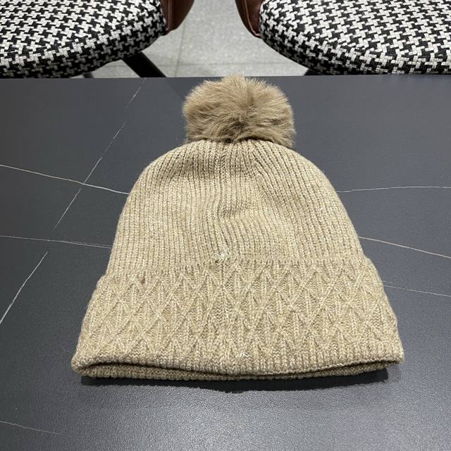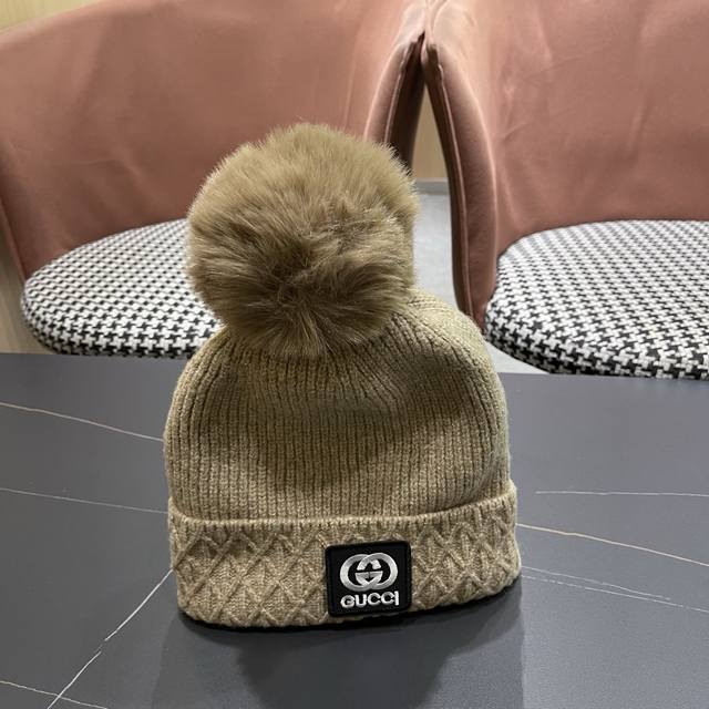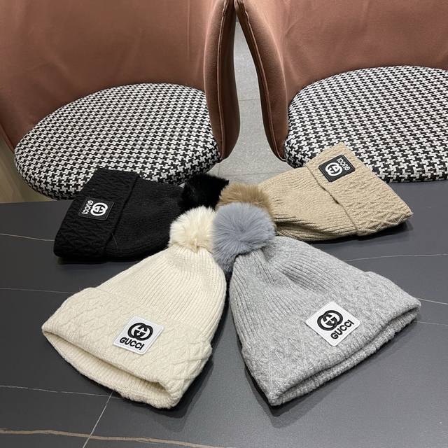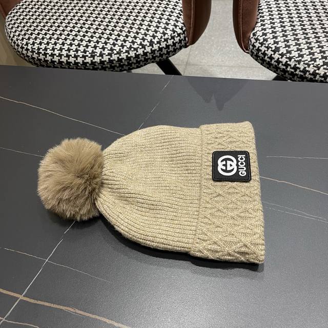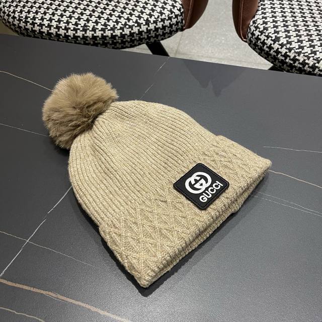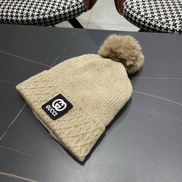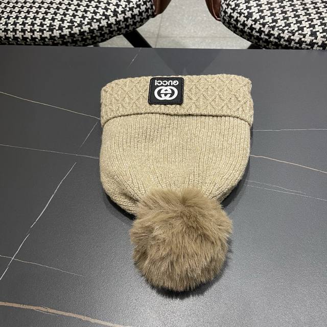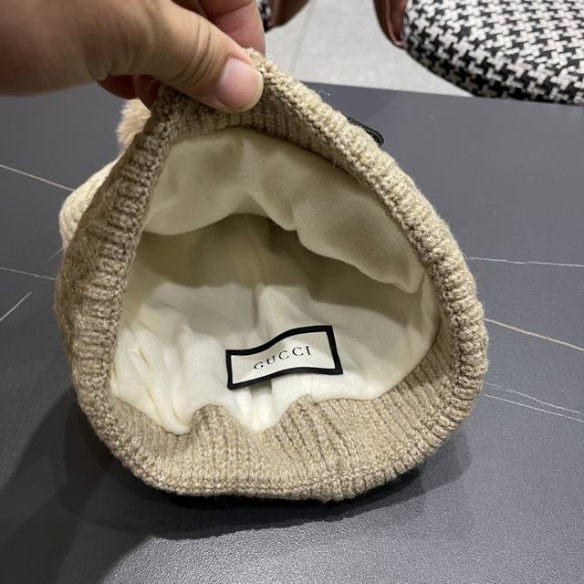 Gucci Pom-Pom Wool Hat, Autumn/Winter, Fleece Lined, Thick, Korean Style Knitted Women's Versatile Warm Pullover Hat with Earflaps DDD