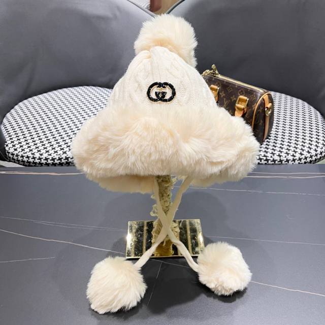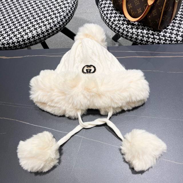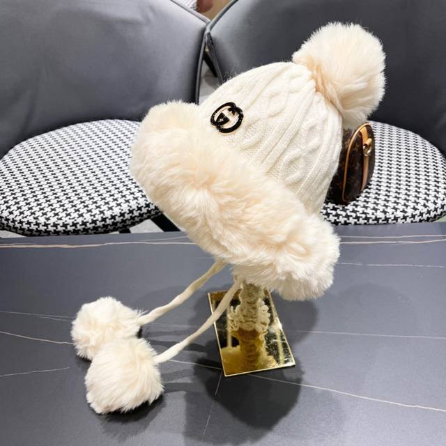 Gucci winter Lei Feng hat for women Korean style trendy all-match cute wool ball knitted wool hat plus velvet warm fashion ear protection hat
