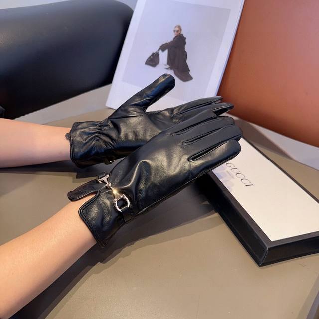 Gucci women's new sheepskin gloves, fashionable gloves, warm and velvet lining f