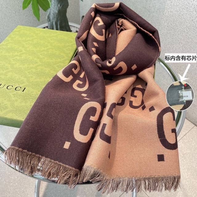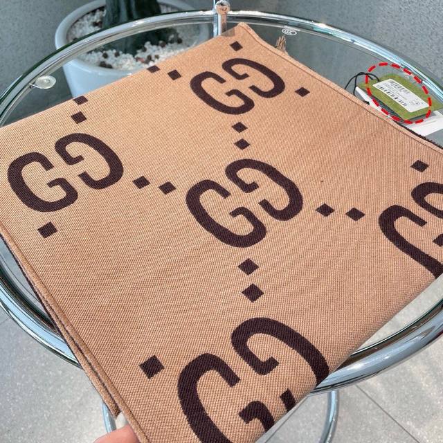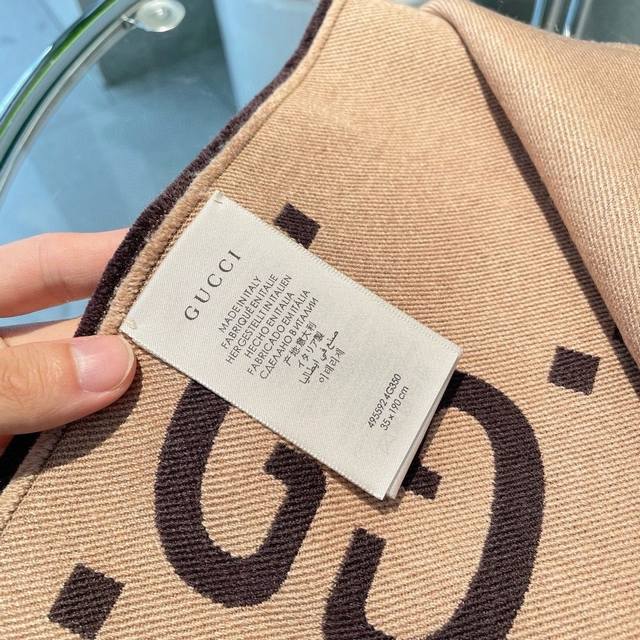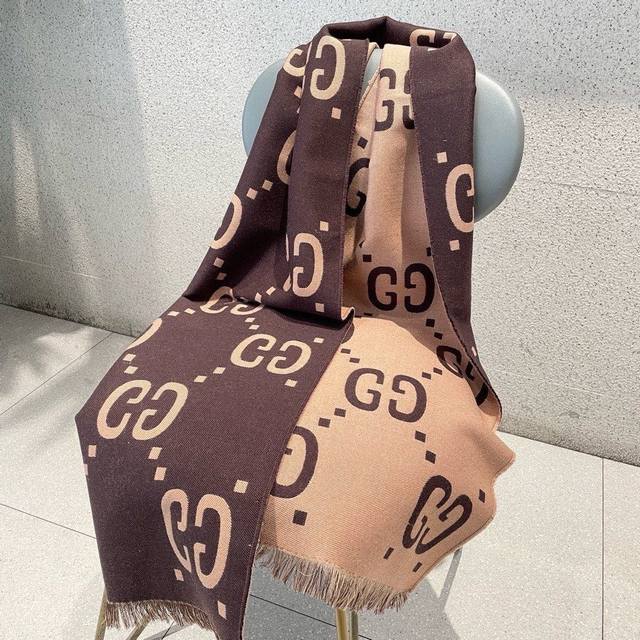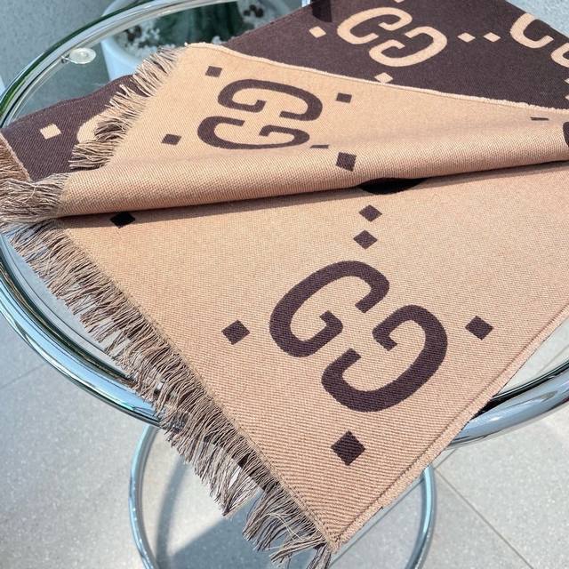 High-end version, hot-selling, new "Apocalypse" edition, arriving simultaneously with boutiques! We're not saying we don't make them, we just haven't perfected them yet. Top-tier version, wool and silk scarf, decorated with an oversized Gg logo. The Gg logo, first used in the 1970s, evolved from the original Gucci diamond design that began in the 1930s and has since become a symbol of Gucci's heritage. The Gg pattern returns to the forefront of fashion in a new way, aiming to pay homage to Gucci's origins. Brown and beige Gg jacquard wool and silk: 35cm wide x 180cm long. Fabric: Silk and wool.
