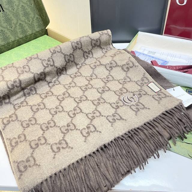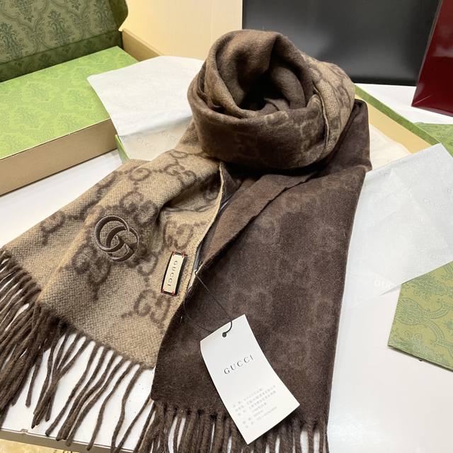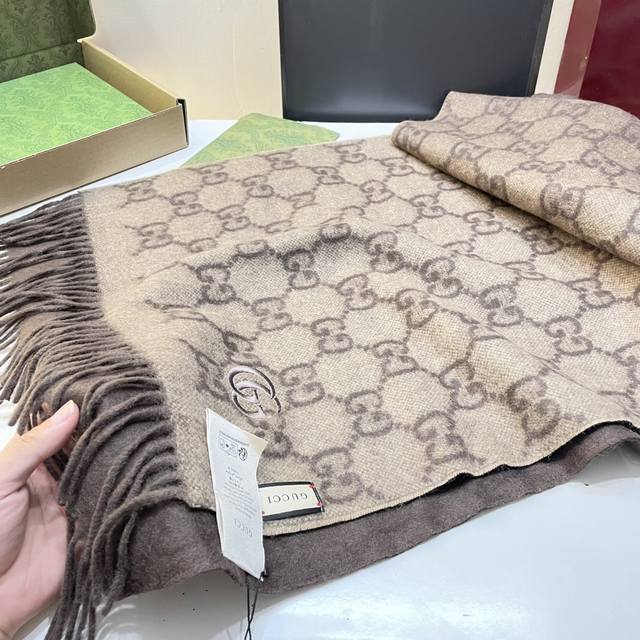 High-quality reversible scarf! The latest double-sided gradient design. The Gg logo, a quintessential element of Gucci, is always integral to the collection, but is reinvented in a modern and innovative way, presenting a unique sense of layering, style, and design. This wool-silk blend scarf features a reinterpreted Gg pattern in a large, fashionable font. 55:195 long scarf! (