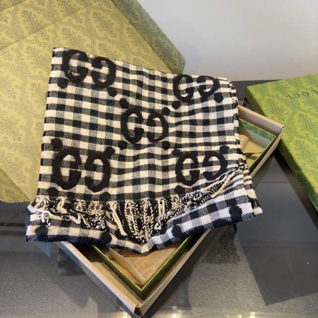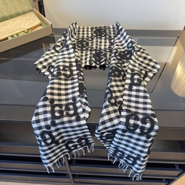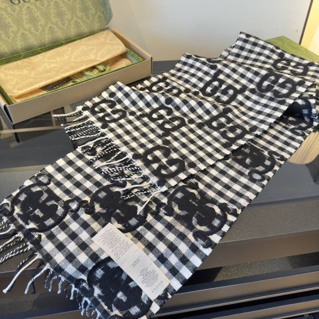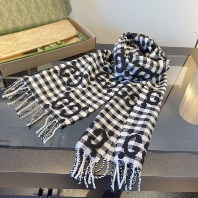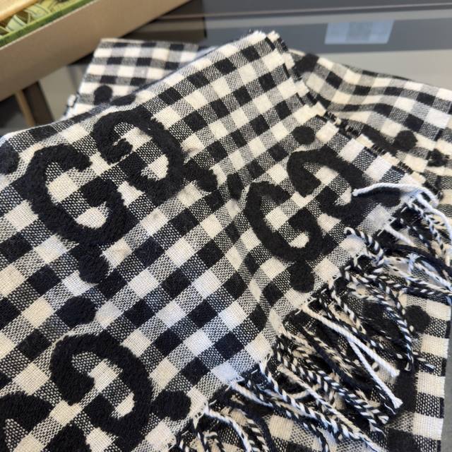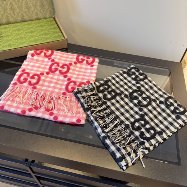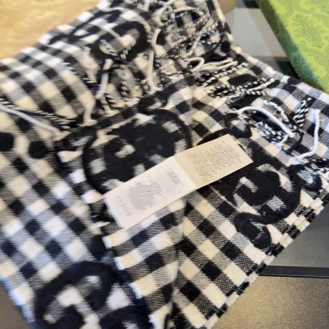 New color arrived! Gucci's new double G jacquard cashmere long scarf, full of girlish charm! Sisters who love plaid shouldn't miss it, a pure and wonderful item~ I really love the color scheme, it's eye-catching and unforgettable, I'm instantly hooked! Super beautiful!!! Top-quality version, buy with confidence!! Color, feel, details, everything is perfect! The fabric of this scarf is different from previous styles, it doesn't look like it's soft and sticky, but it's actually very soft and comfortable, not itchy at all! The size is also a bit longer than previous styles, making it more fashionable!! Size specifications: 35cm wide x 220cm long, 95% wool 5% nylon.