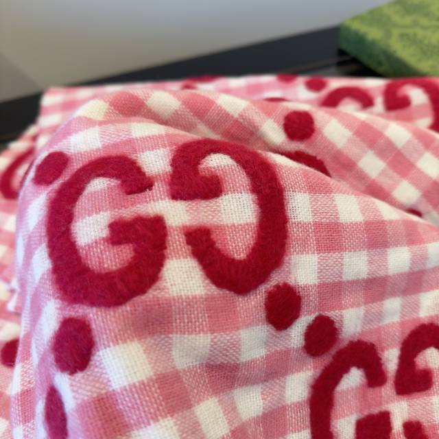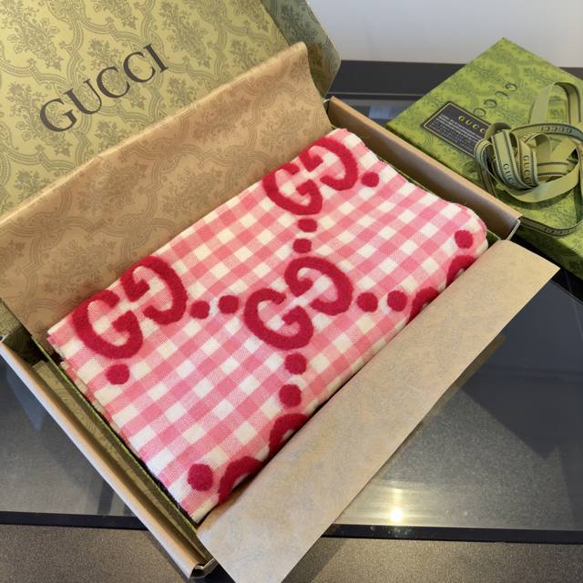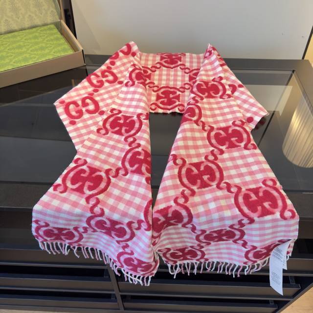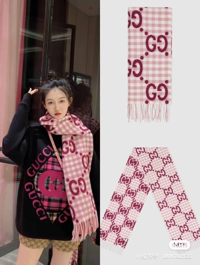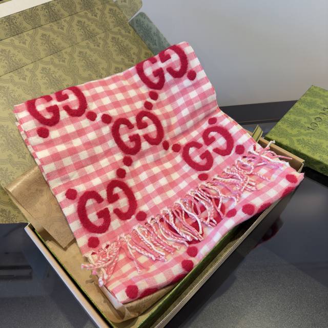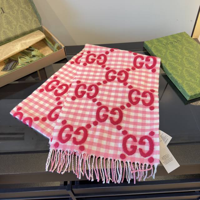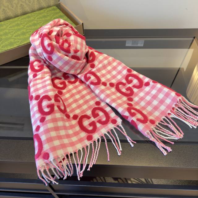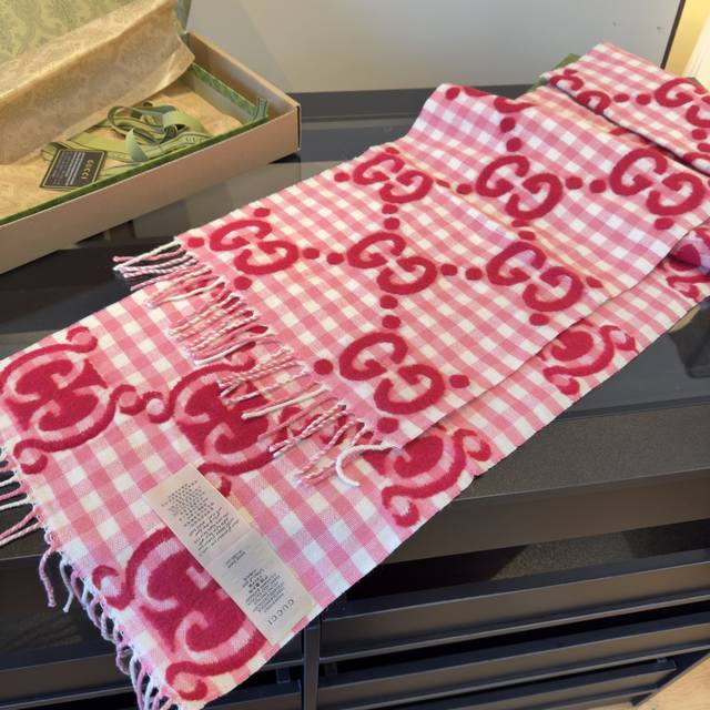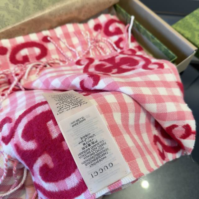 New color arrived! Gucci's new double G jacquard cashmere long scarf, full of girlish charm! Sisters who love plaid shouldn't miss it, a pure and wonderful item~ I really love the color scheme, it's eye-catching and unforgettable, I'm instantly hooked! Super beautiful!!! Top-quality version, buy with confidence!! Color, feel, details, everything is perfect! The fabric of this scarf is different from previous styles, it doesn't look like it's soft and sticky, but it's actually very soft and comfortable, not itchy at all! The size is also a bit longer than previous styles, making it more fashionable!! Size specifications: 35cm wide x 220cm long, 95% wool 5% nylon.