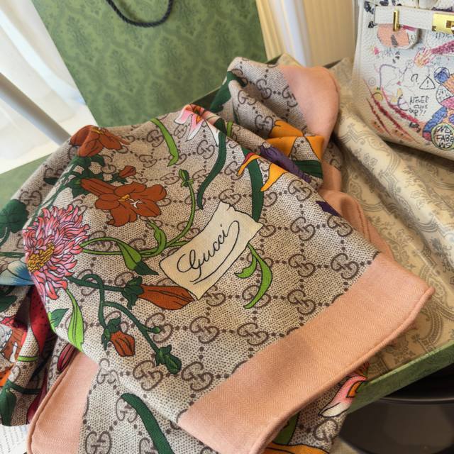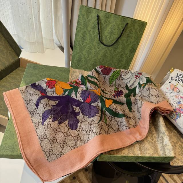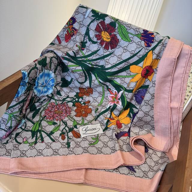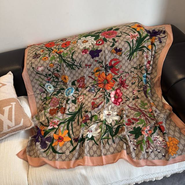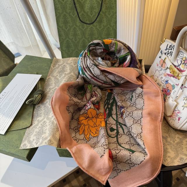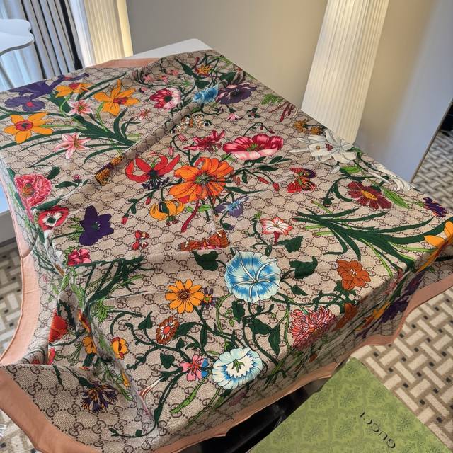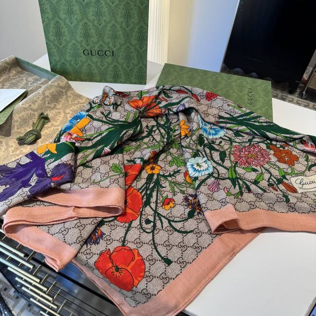 Original Gucci 140cm Velvet Scarf. The classic Gucci floral print is presented with a fresh color scheme and a new style. This scarf features a dazzling multi-color palette, complemented by matching trim. An absolute visual feast of boutique quality that will make you scream! The top-quality silk and cashmere blend herringbone weave is as soft and smooth as velvet, making it a unique and precious item. Sold in overseas boutiques