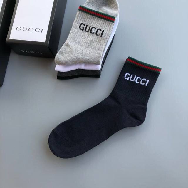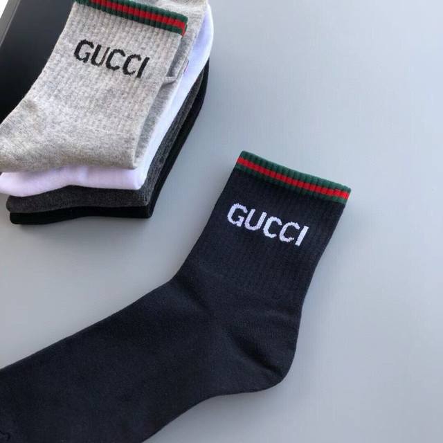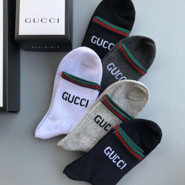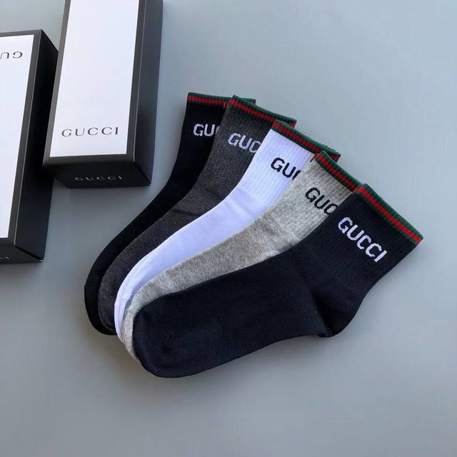 Special Gucci men's socks, five pairs per box, with red and green stripes and the brand's full logo, especially high-end, made of pure cotton, breathable and comfortable, a versatile sportswear style, a super hot item on Instagram, a big brand outing, a must-have for fashionistas, super easy to match