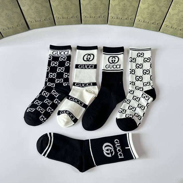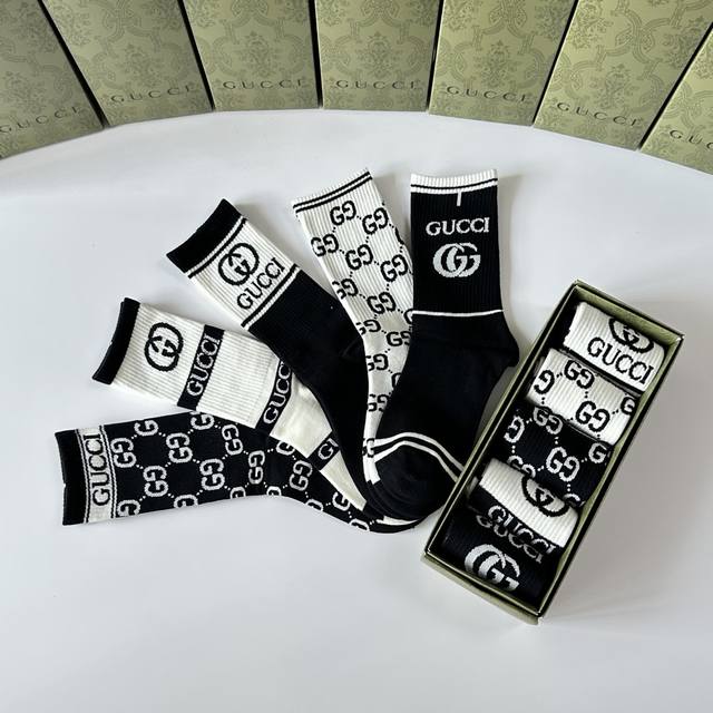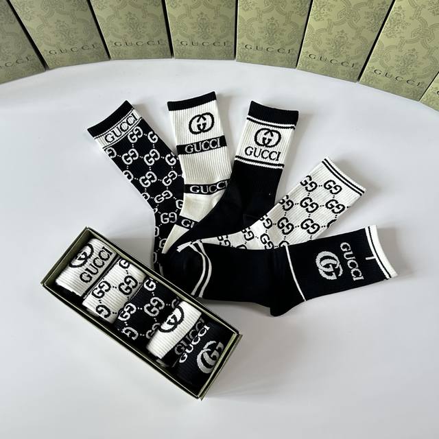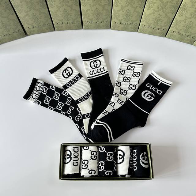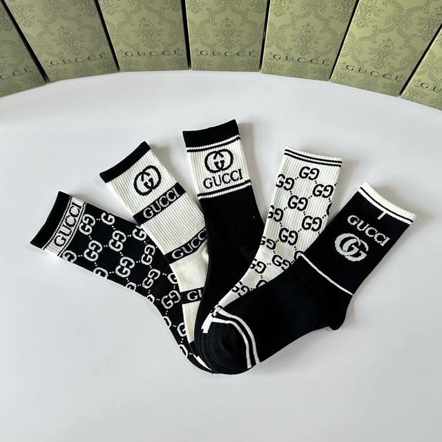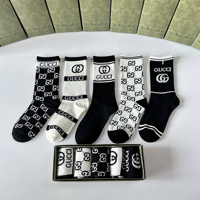 Special Packaging DDD Gucci New Classic Mid-Length Slouch Socks! Five pairs per box, same style as in boutiques, designer streetwear, a must-have for trendsetters, super easy to match. DDD