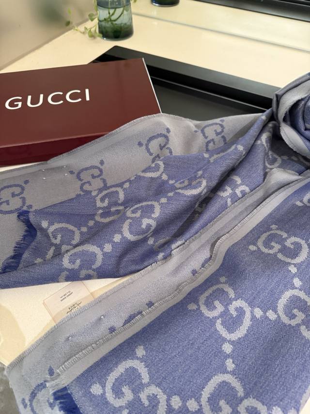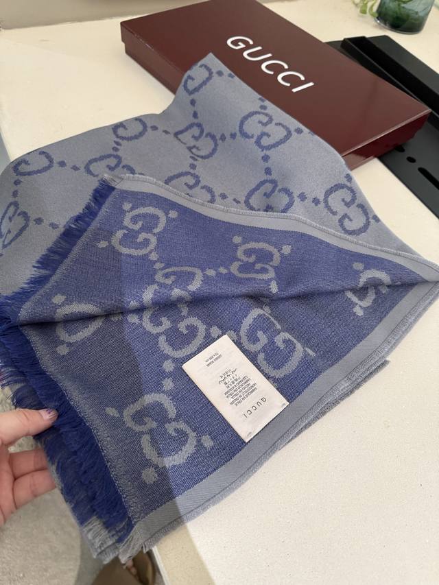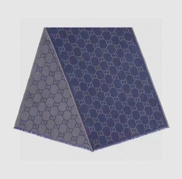 The Gucci pattern, presented in an interwoven letter design, is beautifully showcased on this beige and blue wool-silk blend shawl. Beige and blue Gucci wool-silk blend fabric, 70.1 cm long x 70.1 cm wide, 70% wool, 30% silk.