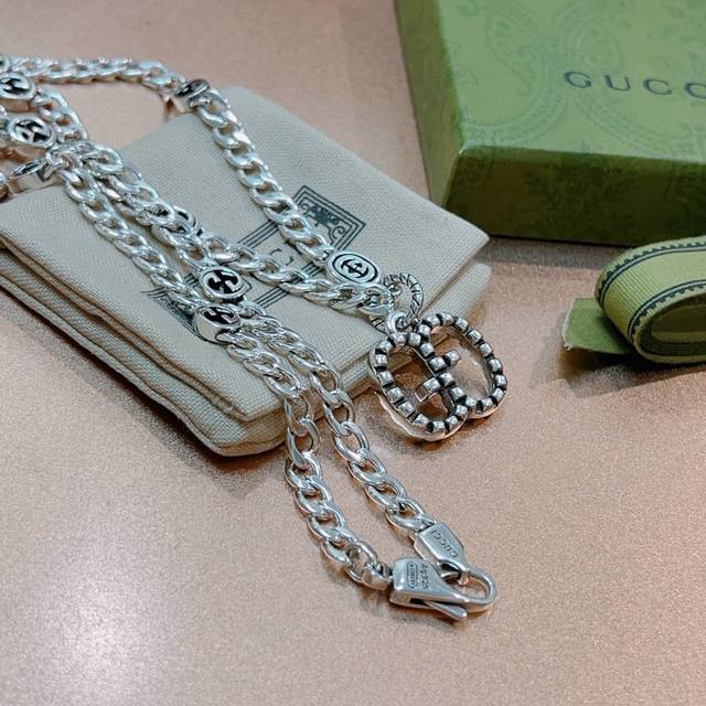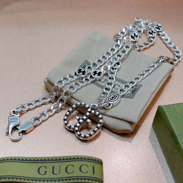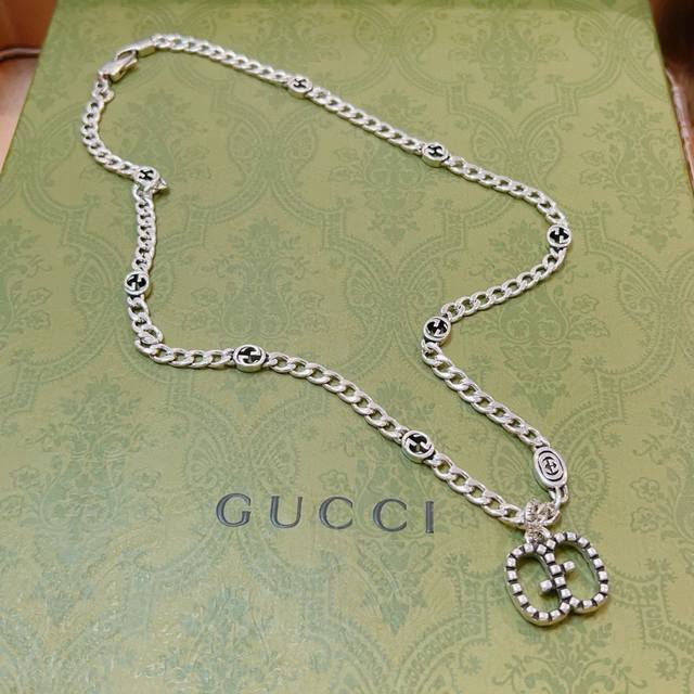 A must-have for Douyin influencers! This latest Gucci necklace from the Anger Forest series boasts a more upscale chain and is a celebrity favorite. Featuring a double G design and vintage patterns, this Gucci necklace elevates your style and makes you look more sophisticated and unique. The details are exactly as pictured, with a distressed finish unlike the glossy versions found elsewhere. This is a consistently popular and versatile piece from Gucci.