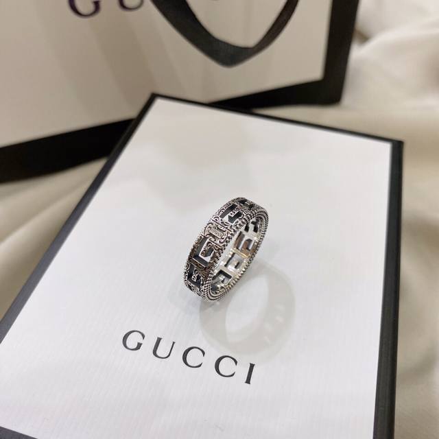 Gucci 925 Sterling Silver Square G Antique Hollowed-Out Narrow Ring (Ddd) Sizes