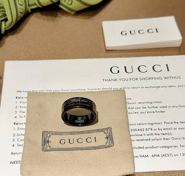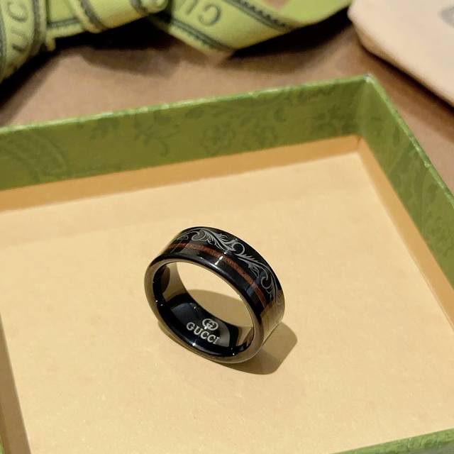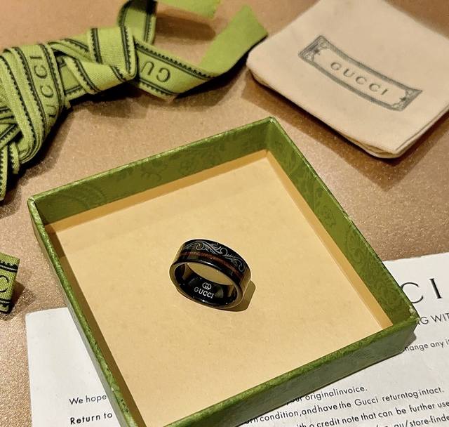 Gucci ring, latest style, higher grade, celebrity style, Anger Forest series, V gold with a deep, rich texture, double G, pure handmade craftsmanship, Gucci ceramic ring, high-end custom design. Details perfectly matched to the original, pure handmade finish, not the glossy version found in the market. This is a consistently best-selling Gucci ring, very easy to match with trendy clothes. Sizes available: 7, 8, 9, 10, 11. Unisex couple ring.