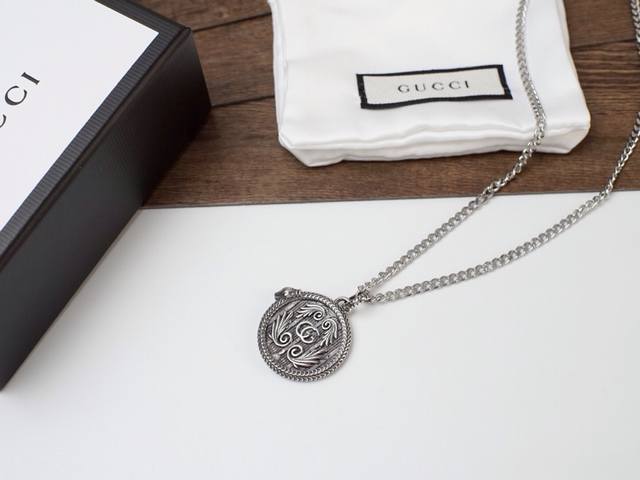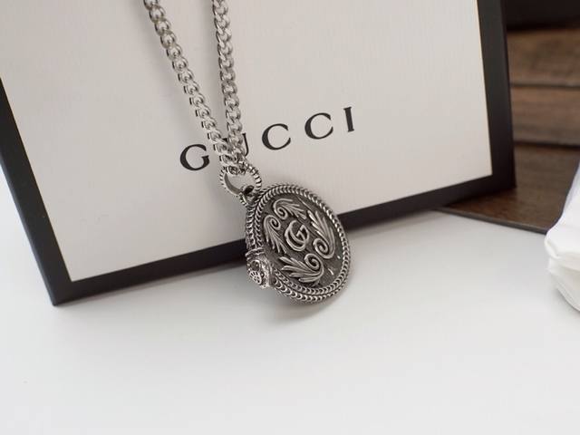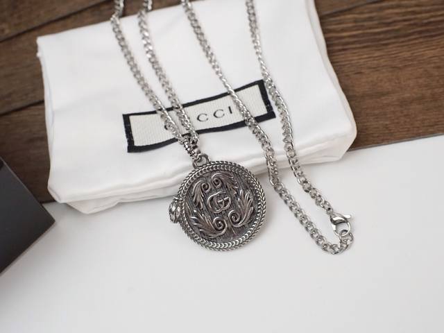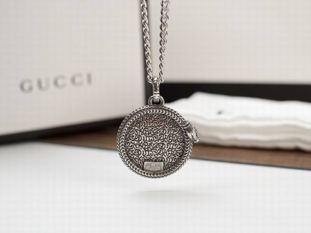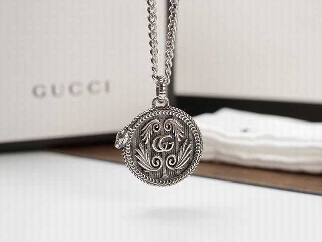 Gucci snake-trimmed double G wing pattern round pendant necklace. The snake-shaped piping adds a finishing touch to the pendant, and the engraved pattern is lifelike, giving it a retro and unique feel.