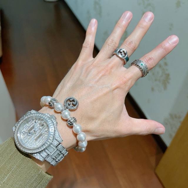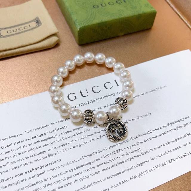 Gucci unisex pearl bracelet, latest style, higher-end, celebrity-endorsed Anger Forest series double G pearl bracelet. Size: 16-24cm. Features full, round pearls. Accurate details, distressed finish (not the glossy type found elsewhere), and superior craftsmanship. This is a consistently best-selling Gucci piece that goes very well with any outfit.