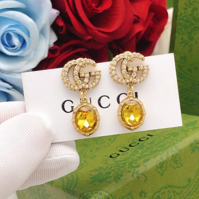 Item No. Ged0091 Yellow Gucci Double G Stud Earrings. Highly recognizable double G logo with a large gemstone. Different colors to match different outfits. Black/Antique Gold distressed finish. Vintage Gucci large rhinestone earrings. Full of retro fashion. A versatile piece.