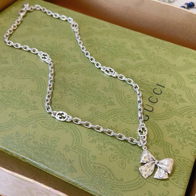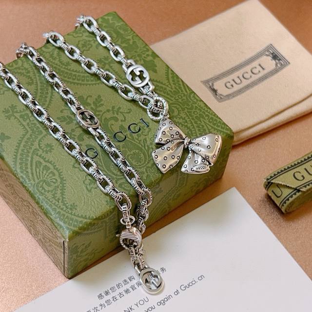 New bow-knot necklace for men and women. This is the latest 2025 Gucci necklace, a higher-end chain and a celebrity favorite. This Anger Forest series double G Gucci necklace has a 60cm chain length, adjustable length. Details include a distressed finish, unlike the standard glossy finish. This has always been a Gucci bestseller, perfect with trendy outfits.