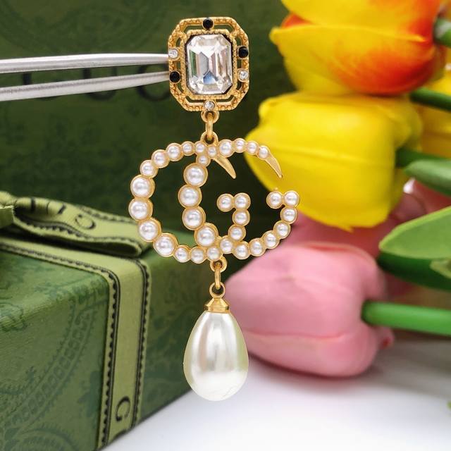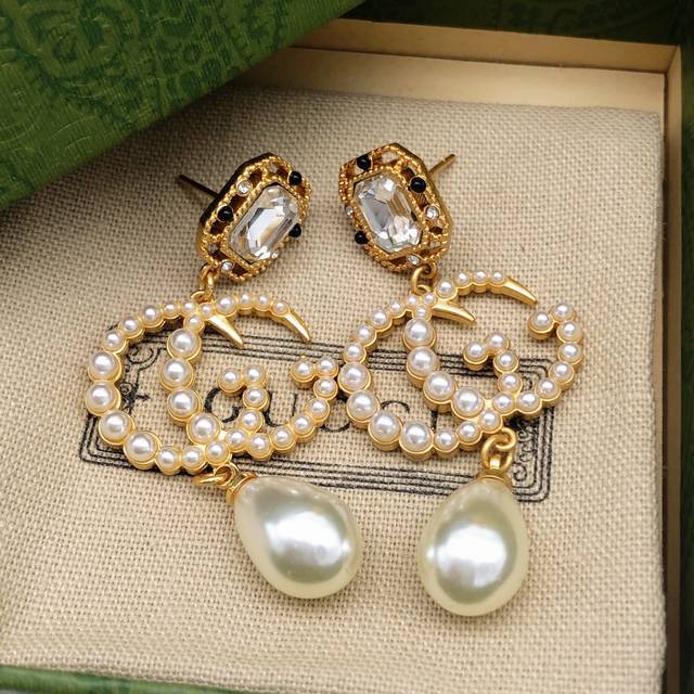 Gucc I Gucci new crystal square diamond flow Sumi pearl dripping pearl earrings