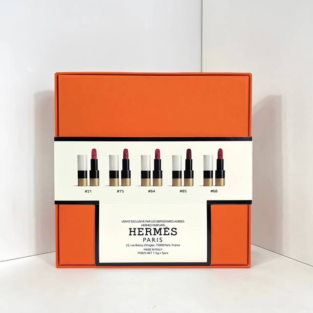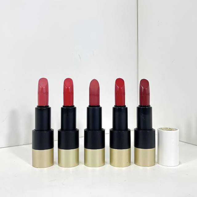 Hermes New Year limited edition gift box set of 5 samples in stock! Hermes lipsticks are all cylindrical, with uniformly white caps. The texture is impressive just by looking at the cross-section of the lipstick! Matte textures have pointed tips, while satin textures have round tips. Inspired by the elegance of Hermes bags, truly Hermes among lipsticks!