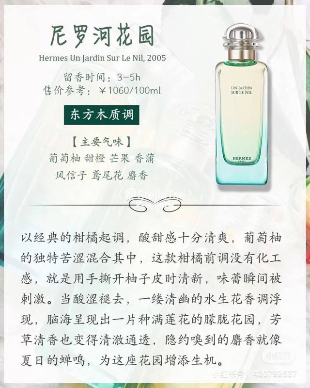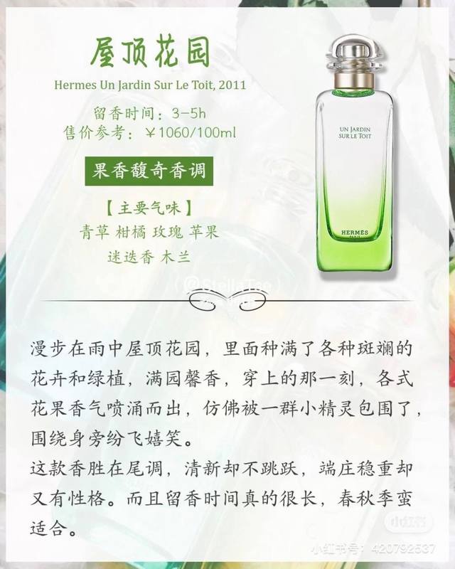 Original Quality Hermes Garden Series Perfumes Hermes Garden Series 1 Nile Garden: Grapefruit, Sweet Orange, Cattail, Hyacinth, Iris, Musk 2 Rooftop Garden: Grass, Mandarin, Rose, Apple, Rosemary, Magnolia 3 Mr. Li's Garden: Kumquat, Jasmine, Mint All three are quite fresh and have a plant-based scent.