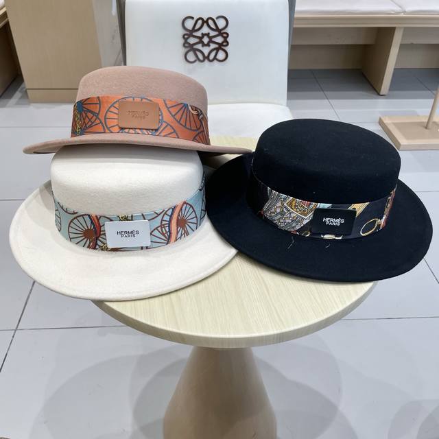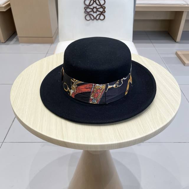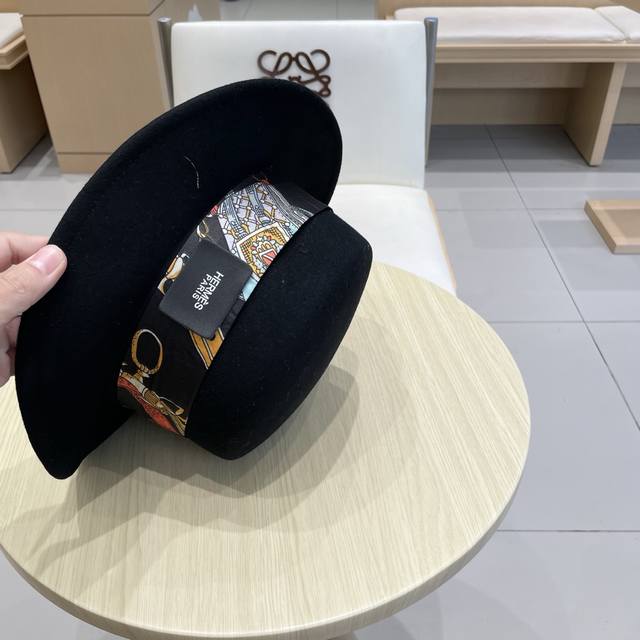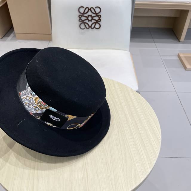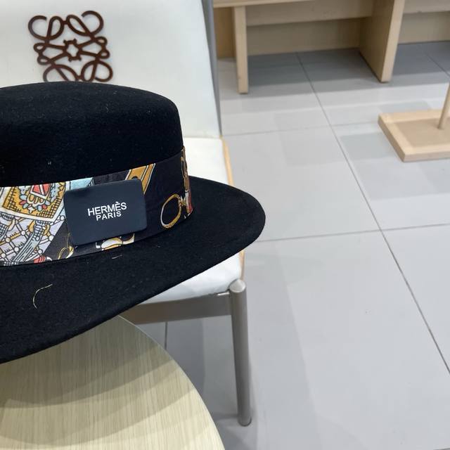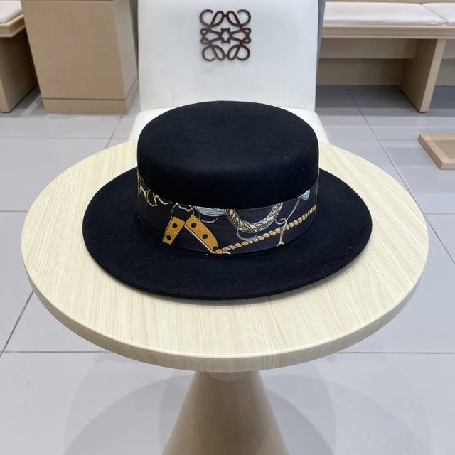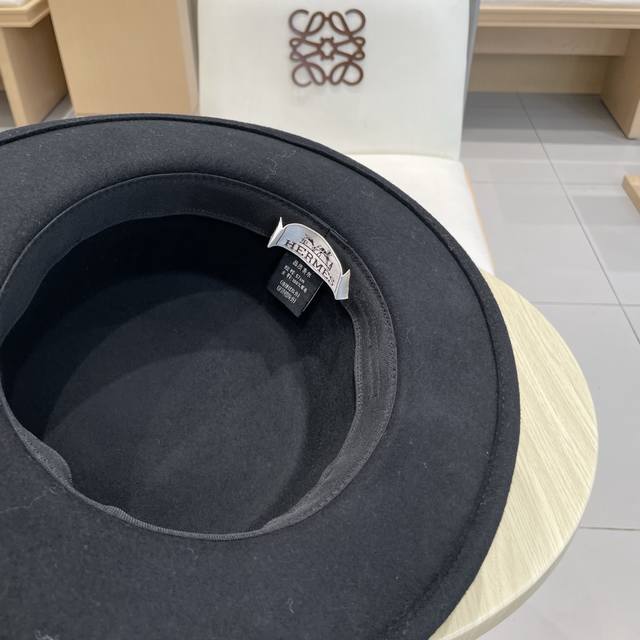 Black and white Herems Hermes 2025 autumn and winter new wool flat hat, 100% wool belt hat, a must-have for fashion goddesses, head circumference 57Cm