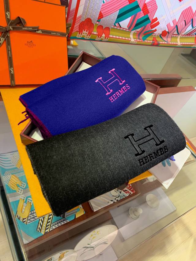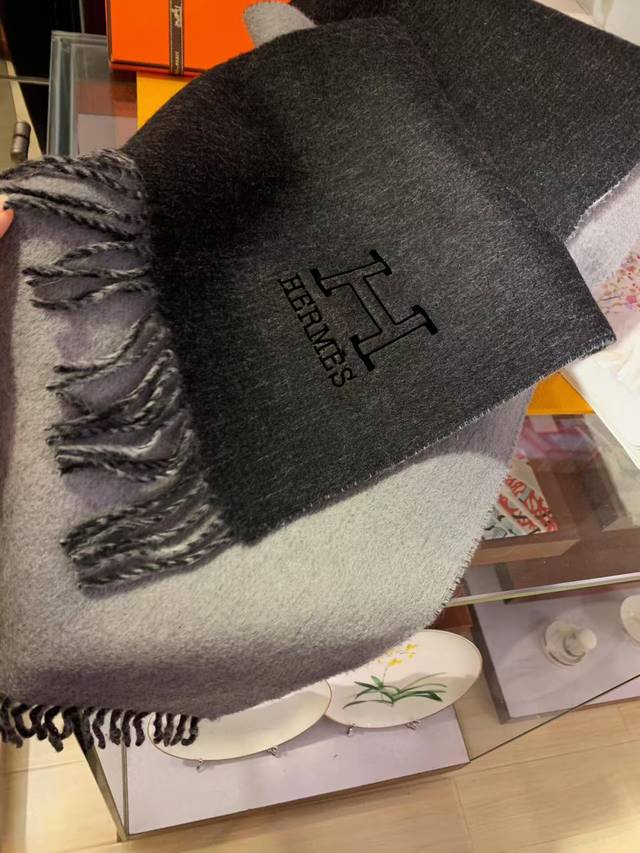 Hermes' latest men's and women's two-tone pure cashmere scarf. Our couple's scarf is a limited-time offer, so buy while you can! The men's version is very rare, only a few styles are released each year, mostly export orders, making it quite hard to find. The classic, generous fabric uses a two-tone cashmere process, making it very thick and warm