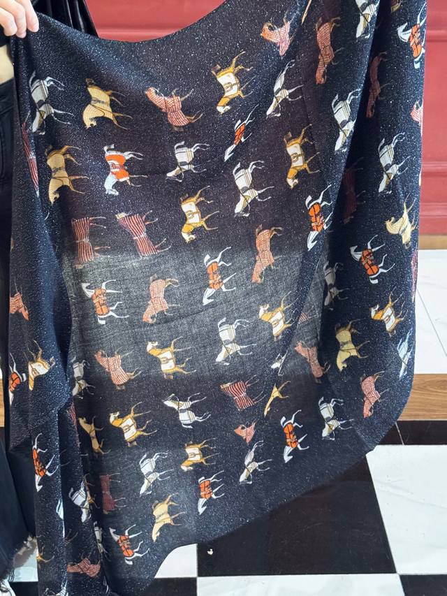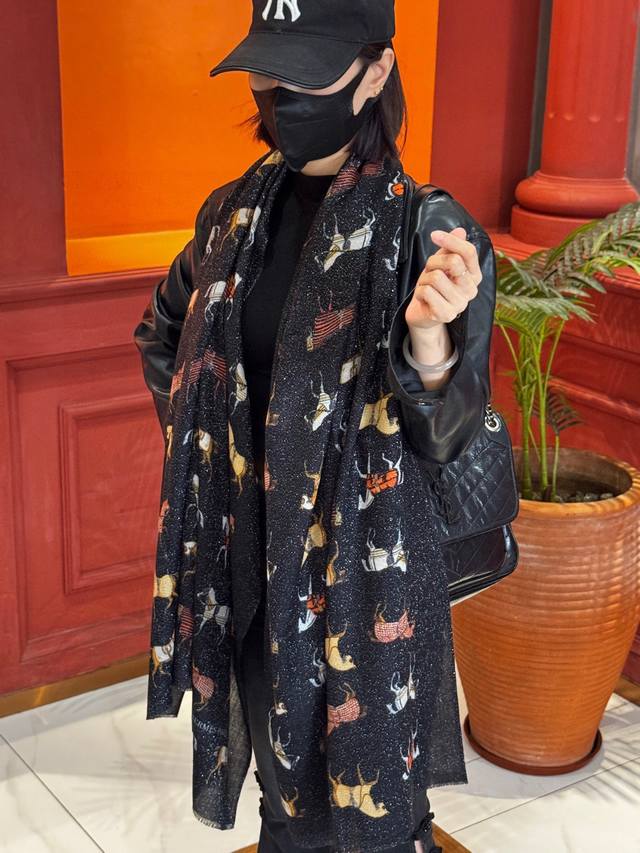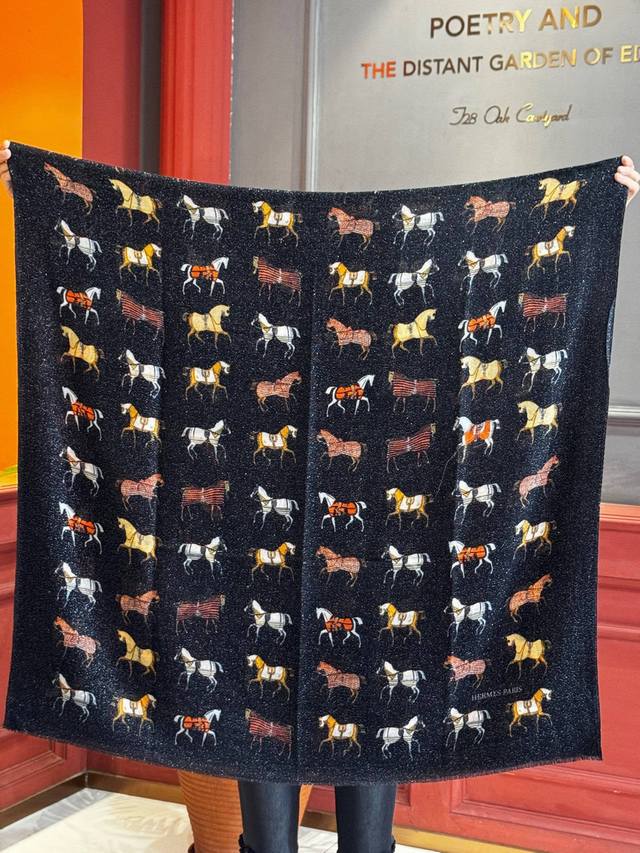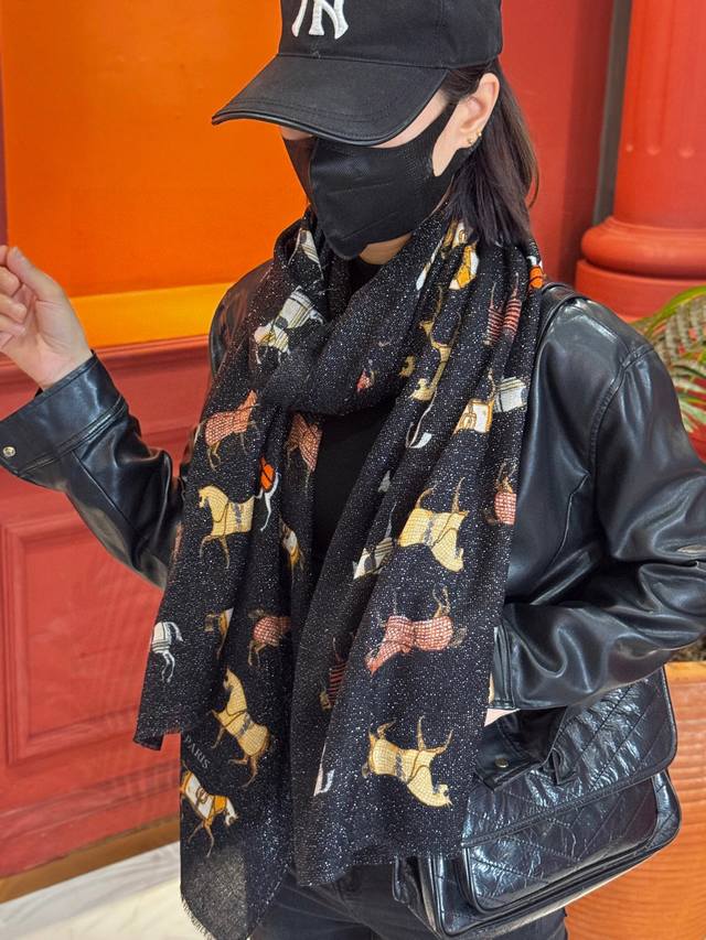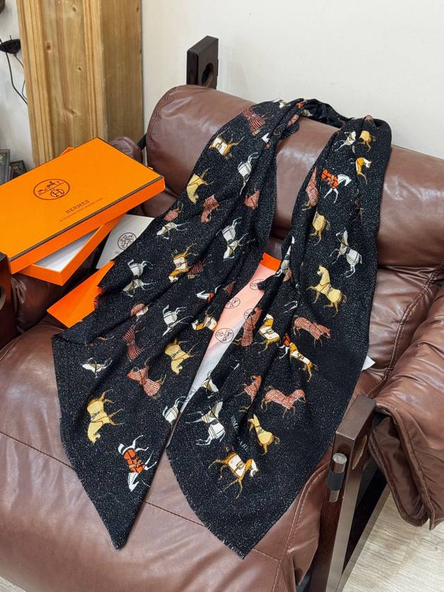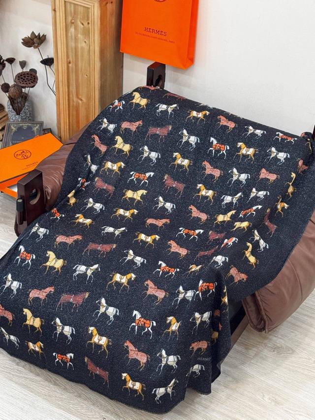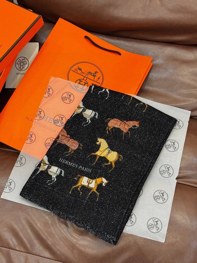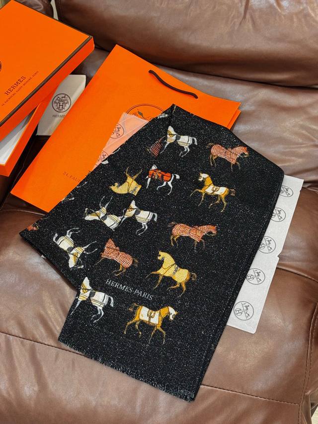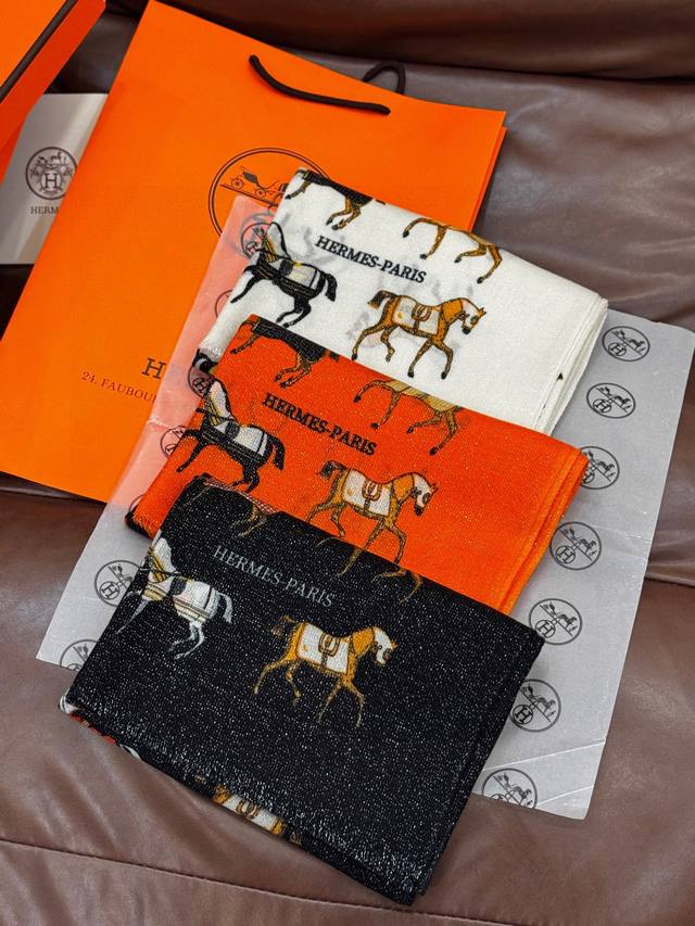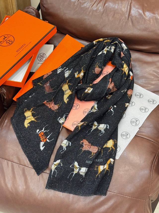 New Arrival! This shimmering, new silver-threaded cashmere long scarf is absolutely stunning! [crying emoji] H brand horse-themed long scarf, a royal-grade, new style, currently available in boutiques. Pure cashmere with silver thread, unique design style, and classic horse pattern print