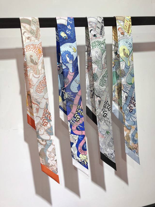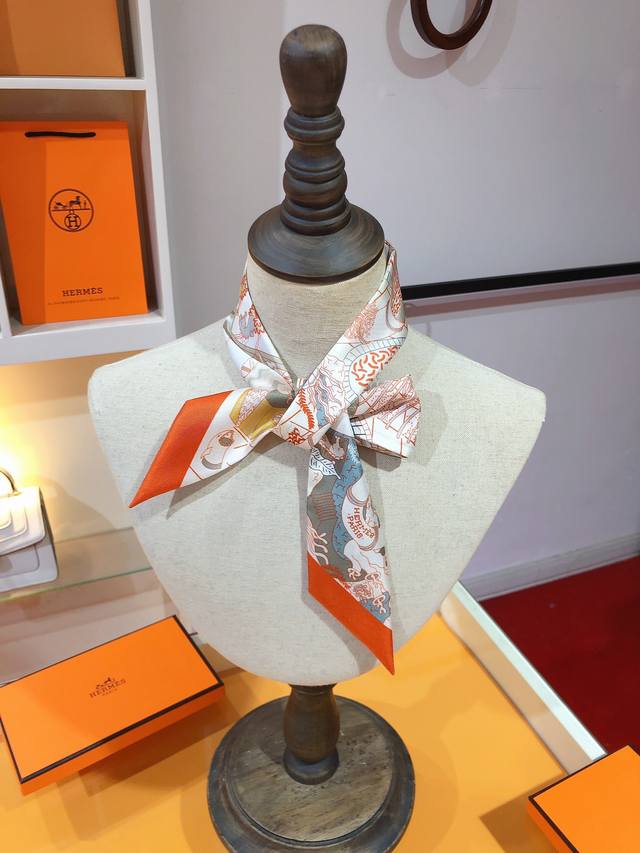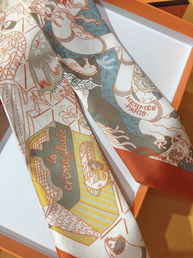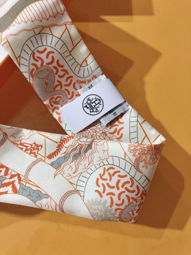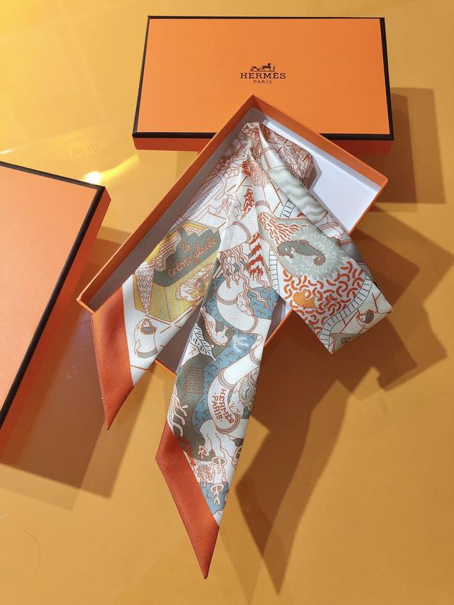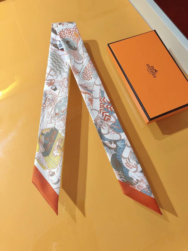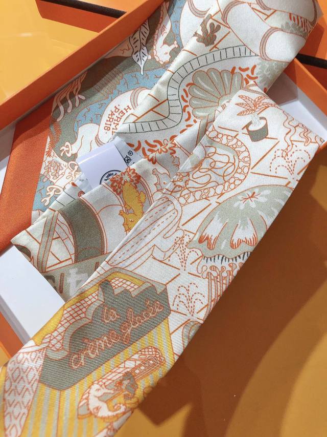 Phms2429 Hermes New Twilly Water Park Ribbon, crafted from top-grade twill silk with exquisitely detailed printed lettering. An absolute must-have for gifting or personal use. The ribbon can be worn around the neck, wrist, or waist, or even adorned with your favorite bag to give it a fresh new look. Specifications: 5 x 86 cm, 100% twill silk, double-layered, double-sided.