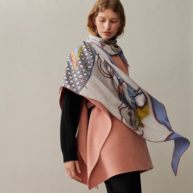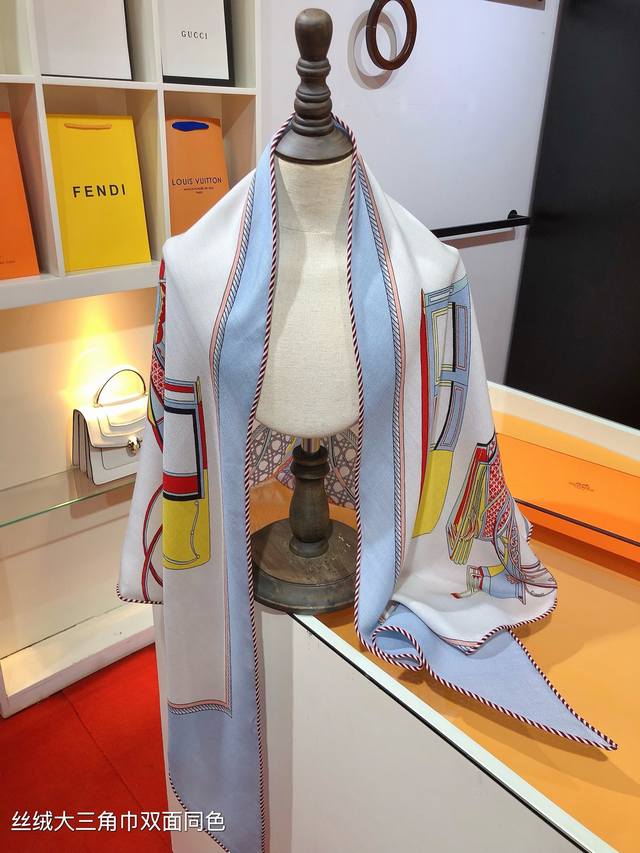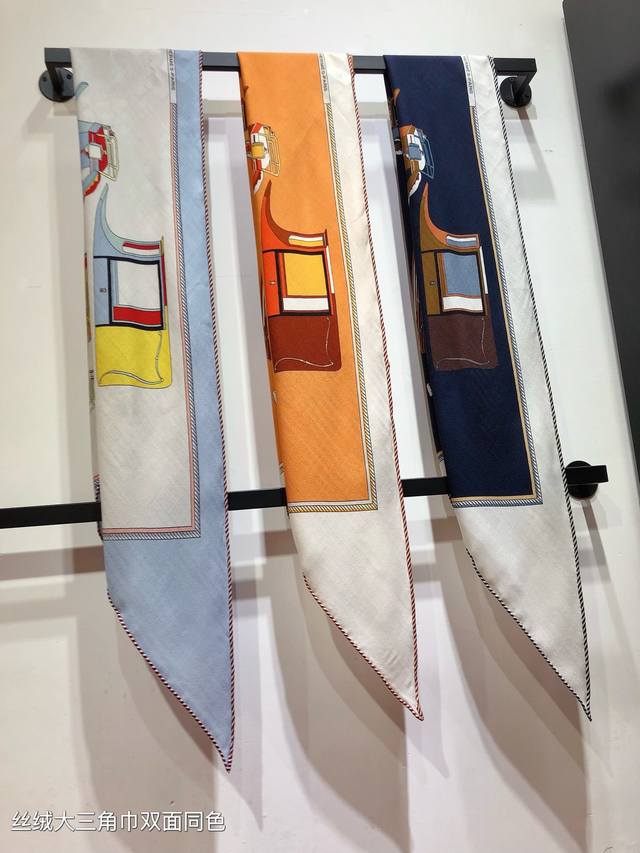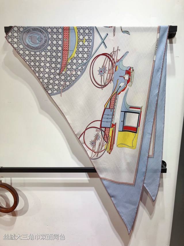 Rhms2469 Original Hermes Car Evolution History Velvet Triangle Scarf, same as boutique items! Like two dragonflies with wide wings, these carriages look incredibly light, ready to take flight at any moment. Decorated with wicker, these carriages were typically used by women, exuding elegance. On sunny days, they accompanied their owners gracefully through the city along tree-lined avenues. This large triangle scarf is made from a classic cashmere and silk blend, soft, lightweight, and easy to wear. You deserve to pamper yourself! It's the perfect companion for cold days, providing warmth and comfort. Super practical, smooth and easy-to-shape fabric, hand-rolled edges. 70% cashmere, 30% silk. Long side 188cm x Bevel 94cm. Reversible color.