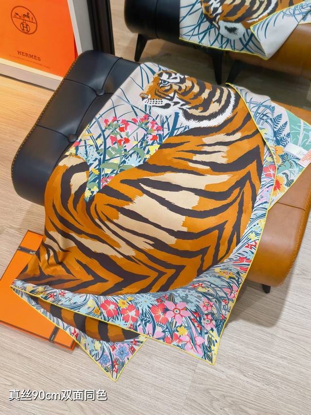 Shms2562 18 momme double-sided 90X90Cm twill silk Hermes Tiger Power Ddd