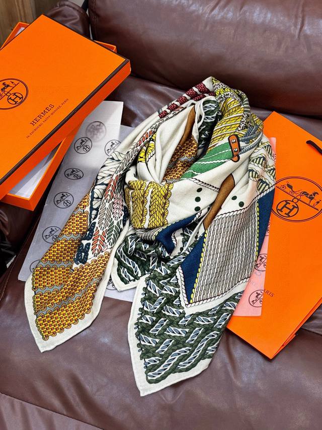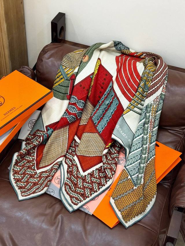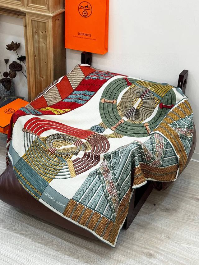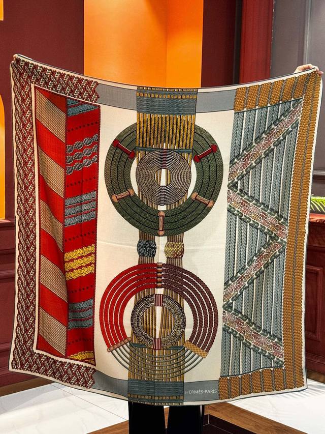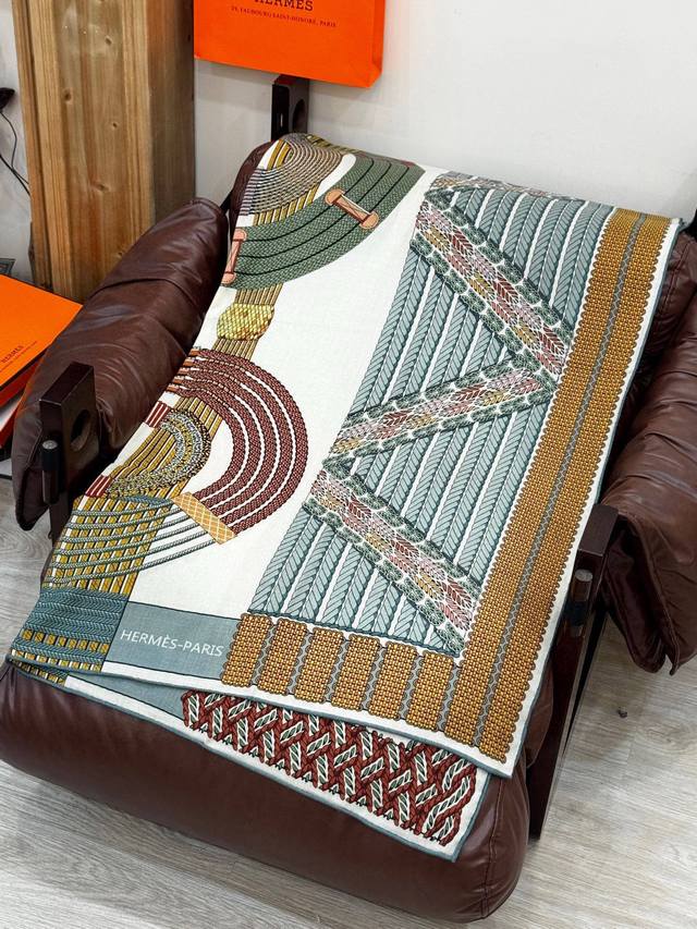that depicts the patterns traced on the ground by natural and artificial horse gaits, resulting in a decorative design that is a free expression of the equestrian weaving repertoire. With its elegantly simple asymmetrical structure, this scarf celebrates decorative craftsmanship.