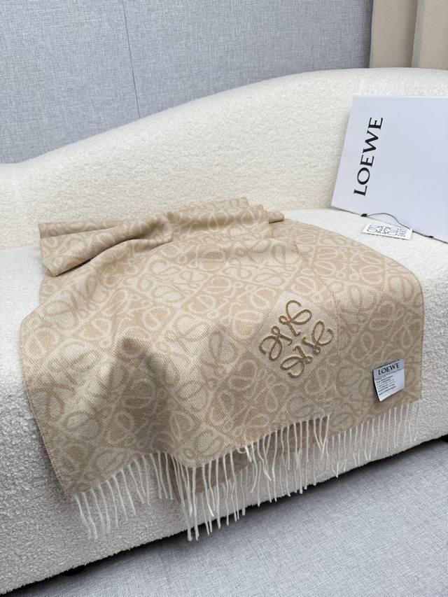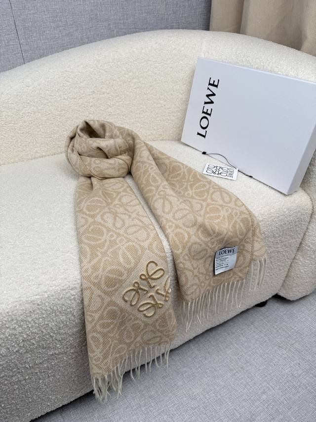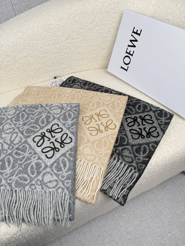 Loewe. New Loewe logo scarf with checkerboard pattern, flocked design, and embroidered logo. The new Loewe logo scarf features a stylish alternating light and dark checkerboard pattern arranged diagonally. A 3D embroidered logo at the corner adds a touch of sophistication. Available in milk tea, light gray, and dark gray. Size: 180*60cm. All three colors are sophisticated, versatile, and flattering for everyone.