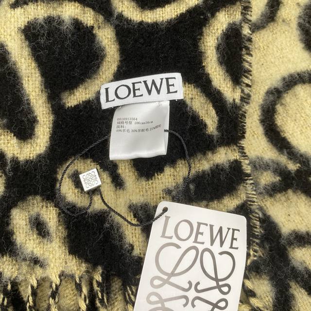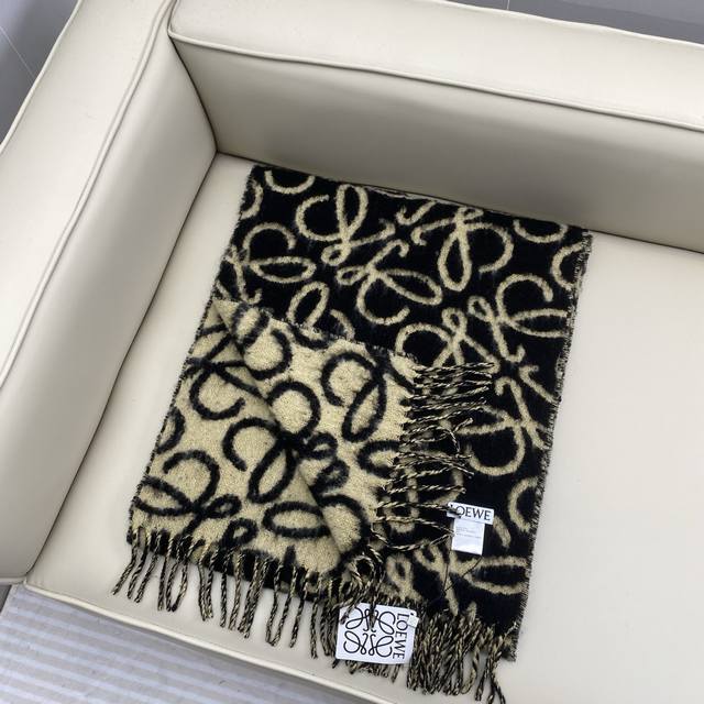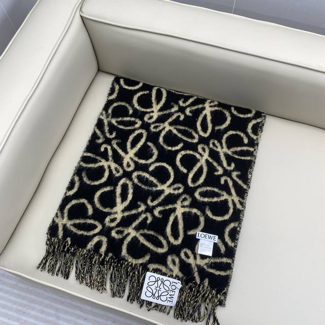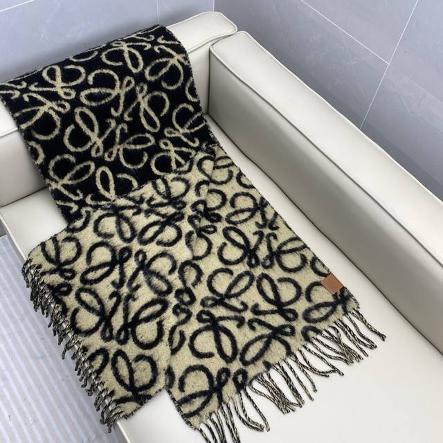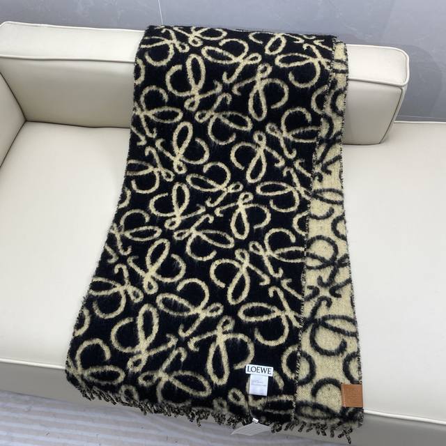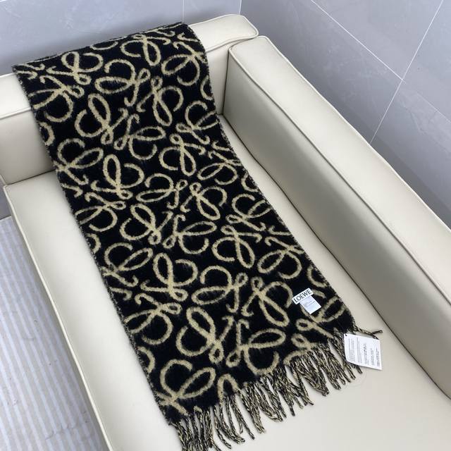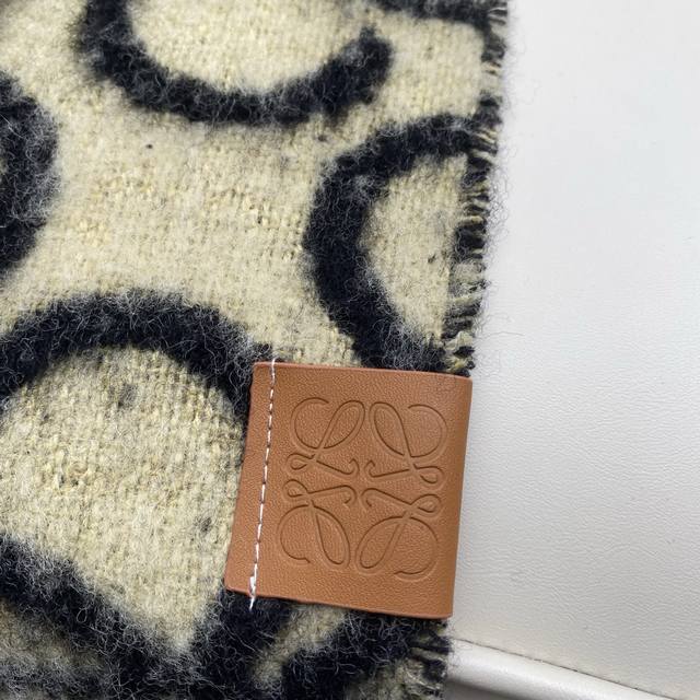 Loewe Wool and Mohair Scarf - Perfect for early autumn, this scarf is a chic and sophisticated choice for a milk tea-inspired look. The milk tea color is a perfect match for early autumn, and the earthy tones are gentle and timeless. This scarf boasts a stunning design with a dreamy color scheme of wool and mohair, accented with tassels at both ends. The fabric is incredibly comfortable. Also includes a cowhide leather logo embossed patch.