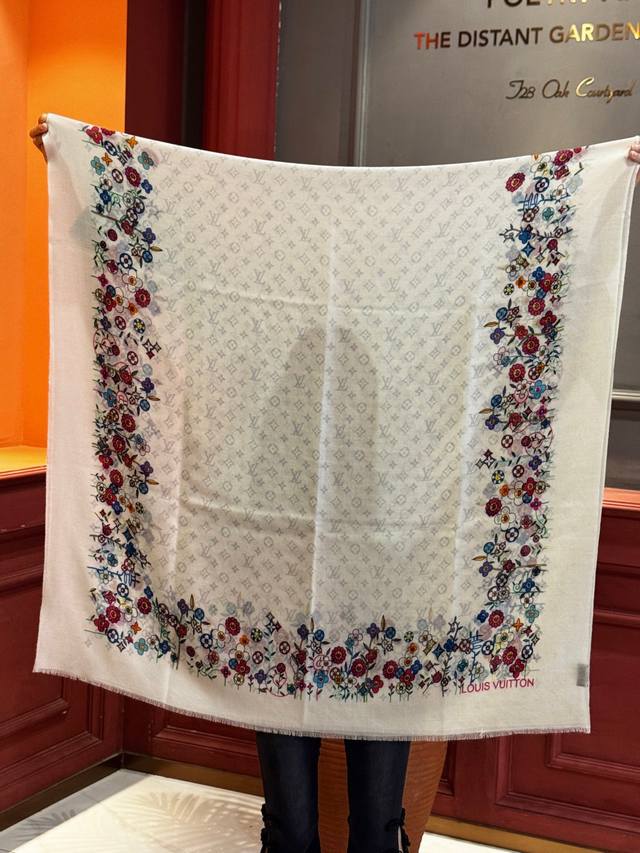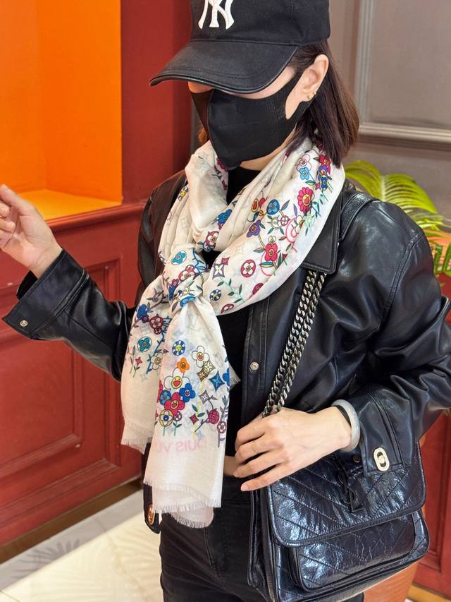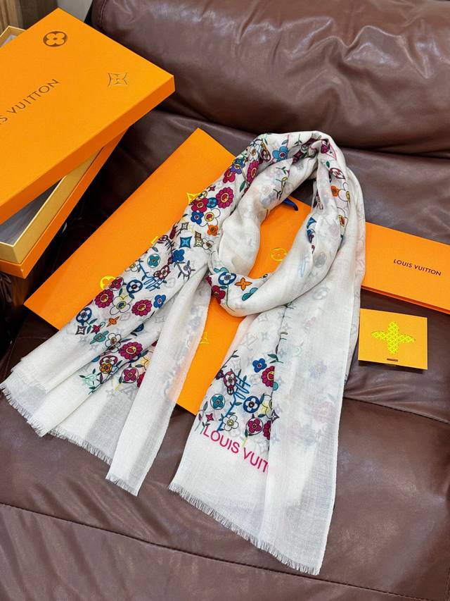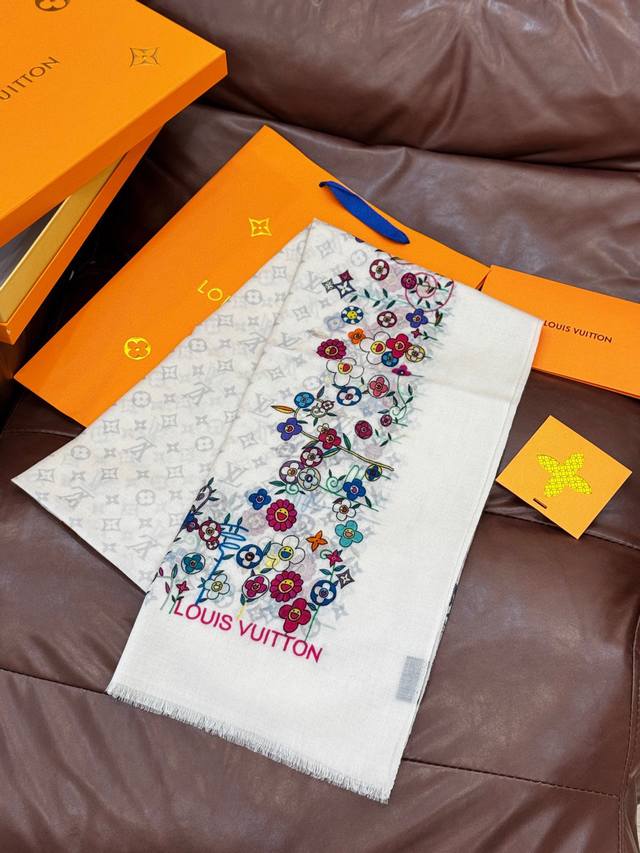 2025 New Arrival - LV x Tm Monogram Superflat Flowers Handkerchief, made with the same material as in boutiques. This handkerchief is from the collaboration between Louis Vuitton and Takashi Murakami. The Monogram pattern is painted across the entire surface of soft cashmere silver thread, while the delicate floral edges pay homage to the artist's "superflat" style. Size: 100*200 mm.