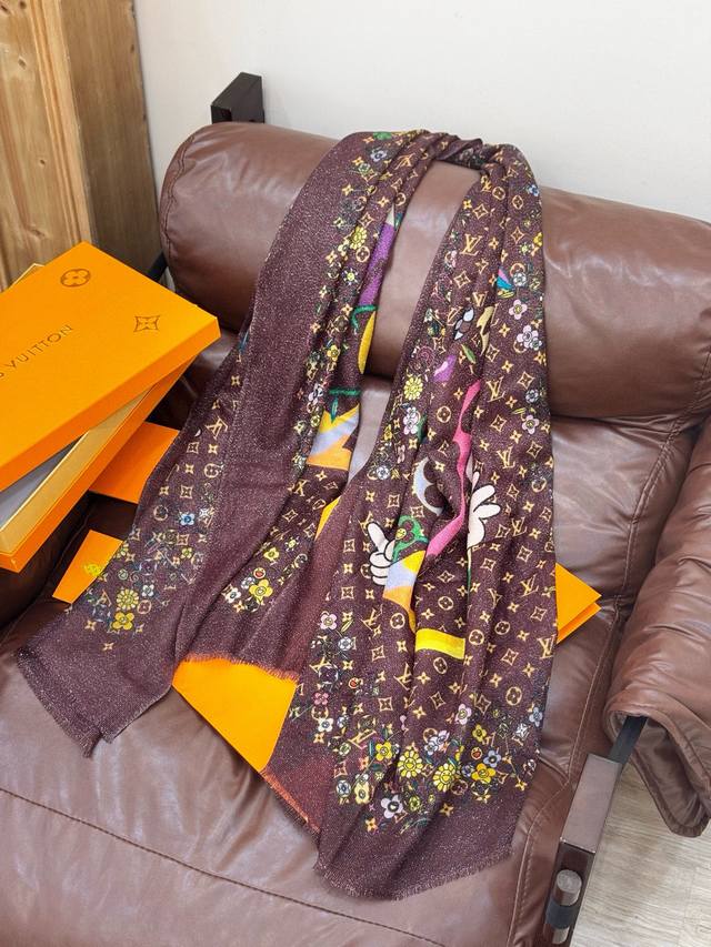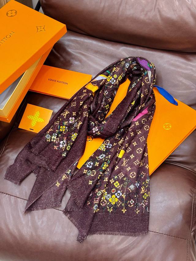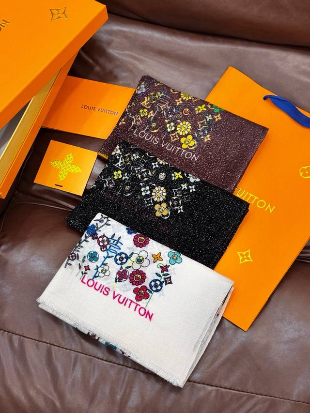 A glowing scarf. New arrival for 25 years, available in the same counter as the original. Material: Lv X Tm Monogram Superflat Flowers. This square scarf is part of a collaboration between Louis Vuitton and Takashi Murakami. It features a soft cashmere and silver silk background with a Monogram pattern, and a dynamic floral border that nods to the artist's "Superflat" style. Size: 100 x 200