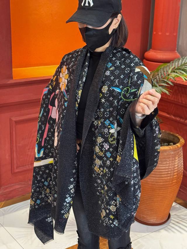 A glowing scarf. New arrival for 25 years, available in the same counter as the original. Material: Lv X Tm Monogram Superflat Flowers. This square scarf is part of a collaboration between Louis Vuitton and Takashi Murakami. It features a soft cashmere and silver silk background with a Monogram pattern, and a dynamic floral border that nods to the artist's "Superflat" style. Size: 100 x 200