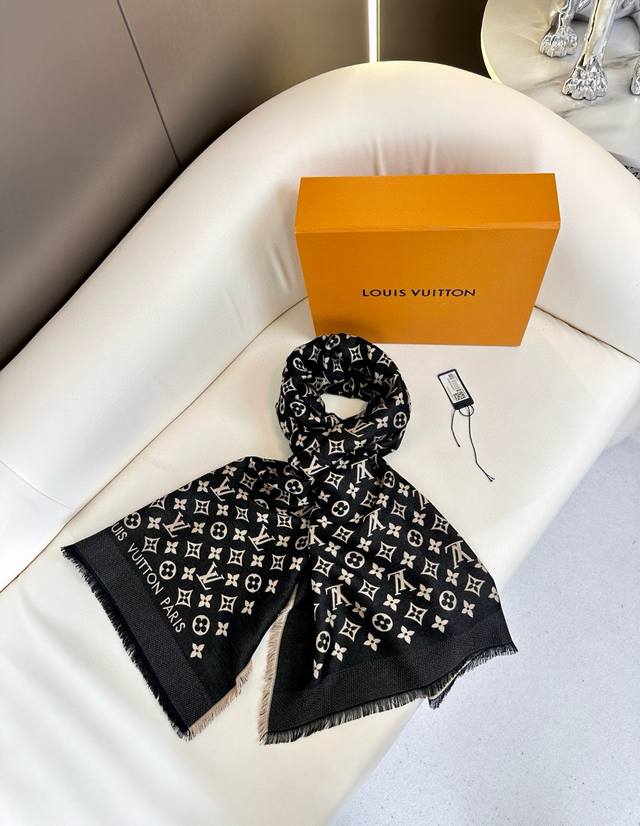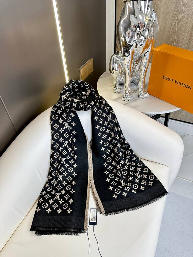 Classic Monogram Long Scarf~ A great item to enhance your temperament and taste. It has received excellent reviews since its release and is a must-have for all seasons!! Truly incredibly practical!! A rare limited edition silk and wool long scarf from LV, featuring special edging design. The fabric feels amazing, slightly thick yet incredibly soft and skin-friendly, with a beautiful sheen and texture! A blend of silk and wool, the LV logo is very tightly and neatly arranged. Perfect for a stylish look at the boutique! The special feature of this scarf is its design: a classic and timeless Monogram jacquard long scarf, but in a long scarf style. Both the front and back colors are beautiful; in fact, there's no right or wrong, it can be worn as two scarves. Classic luxury! 70*200mm size, 70% wool, 30% silk long scarf.
