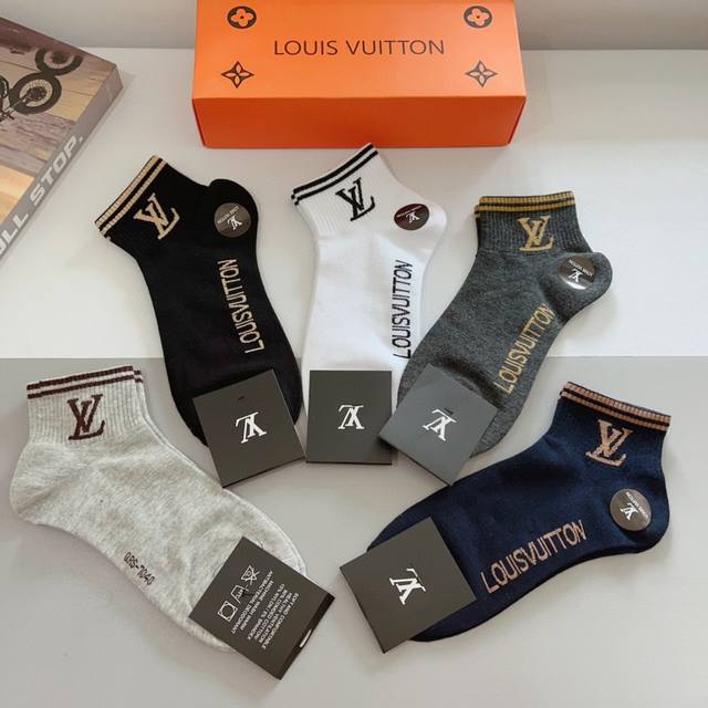Comes with a box of 5 pairs of LV Louis Vuitton's super popular small items, high-version wool fabric, a must-have for fashionistas, classic letter logo mid-length socks, personalized fashion and versatile style! You deserve it! Combed cotton fabric, super soft material, comfortable and breathable, fashionable and versatile style