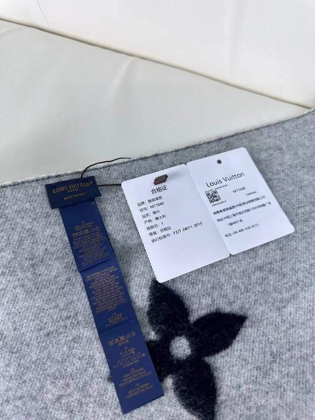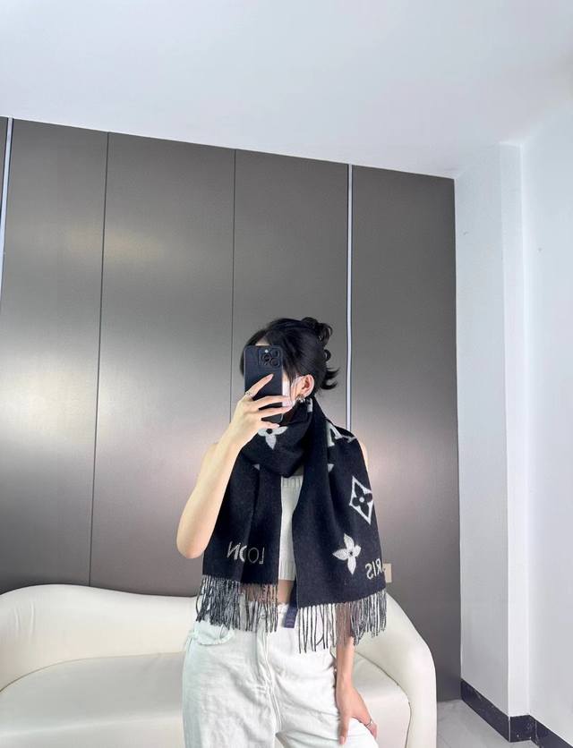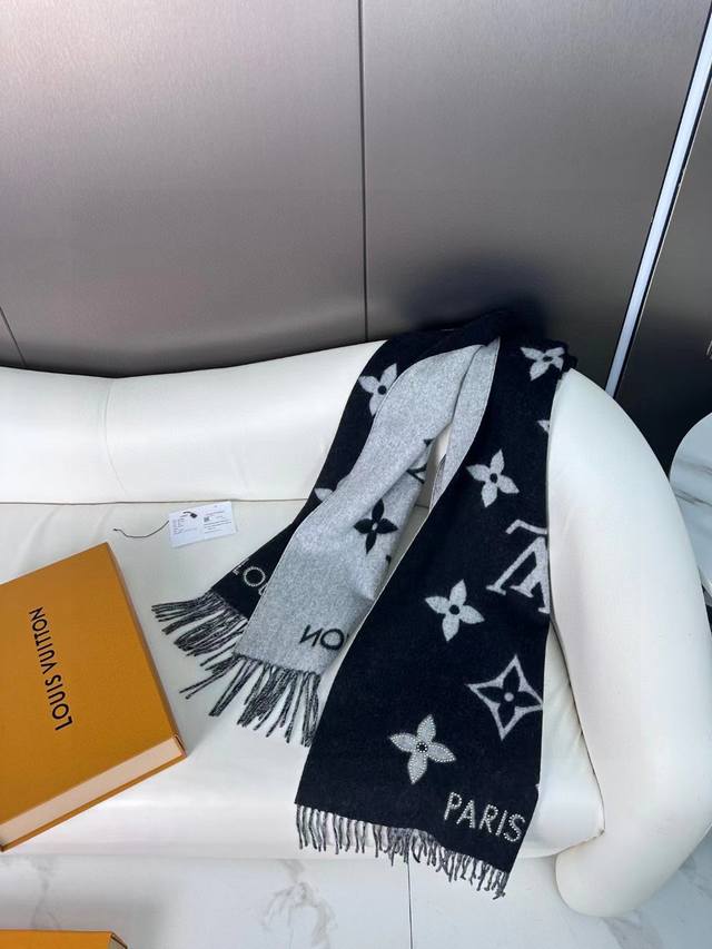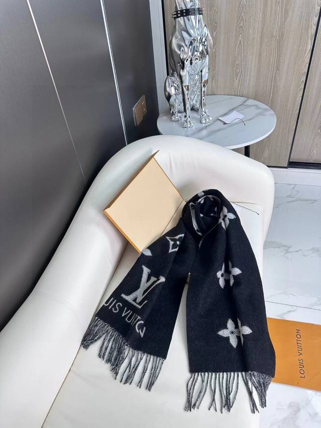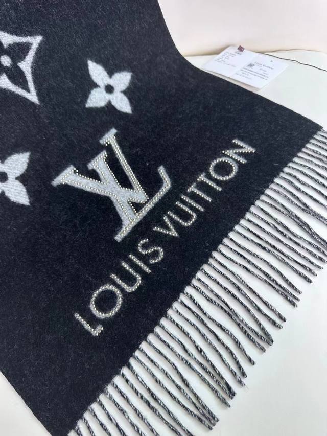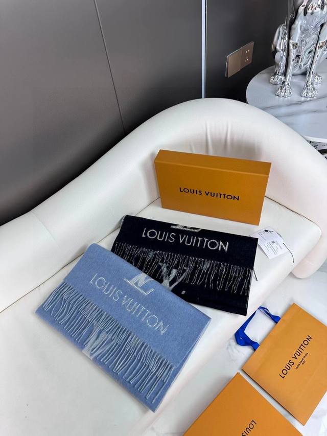 High-quality Louis Vuitton scarf arrives on the New Year! This Studdy Reykjavik scarf, featuring a rock and roll aesthetic, brings a rock and roll vibe to chilly winter days. Soft cashmere fabric is embellished with large Monogram Flowers and the Louis Vuitton initials, accented with polished studs. Lightweight, it's the ideal travel companion. The Monogram Flowers and Louis Vuitton initials feature a jacquard weave pattern with gold-tone metal rivets, while the blue version features silver-tone metal rivets. Contrasting Louis Vuitton lettering is embellished at the base. Dimensions: 170 x 45 cm (excluding beard).