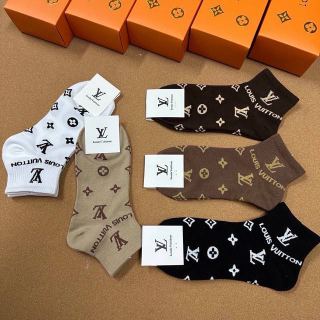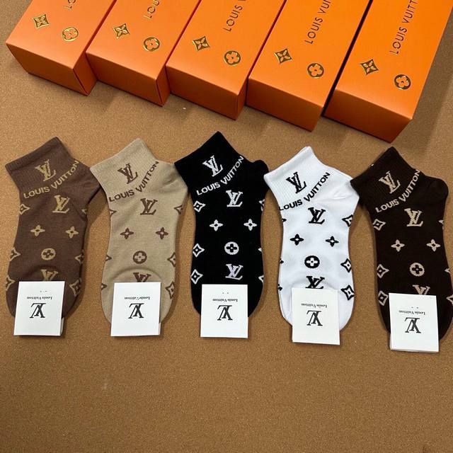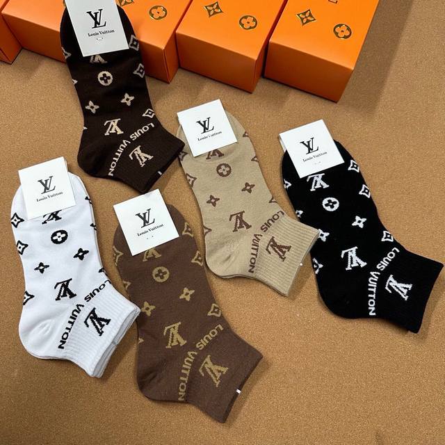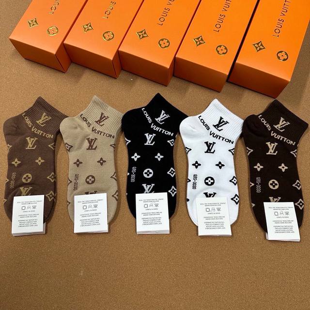 Louis Vuitton classic socks, five pairs per box, jacquard design with the classic Louis Vuitton logo, made of pure cotton, breathable and comfortable. A super nice and popular item, a must-have for trendsetters, and incredibly versatile.