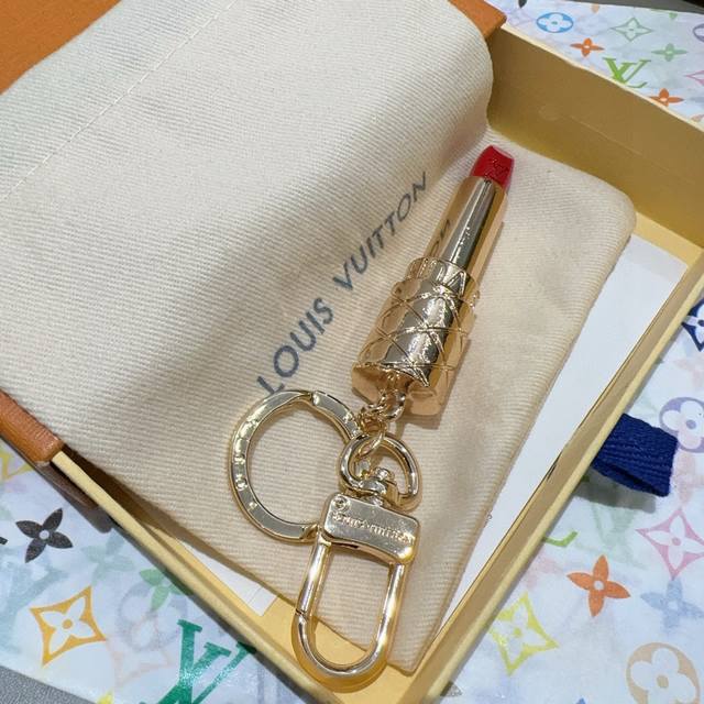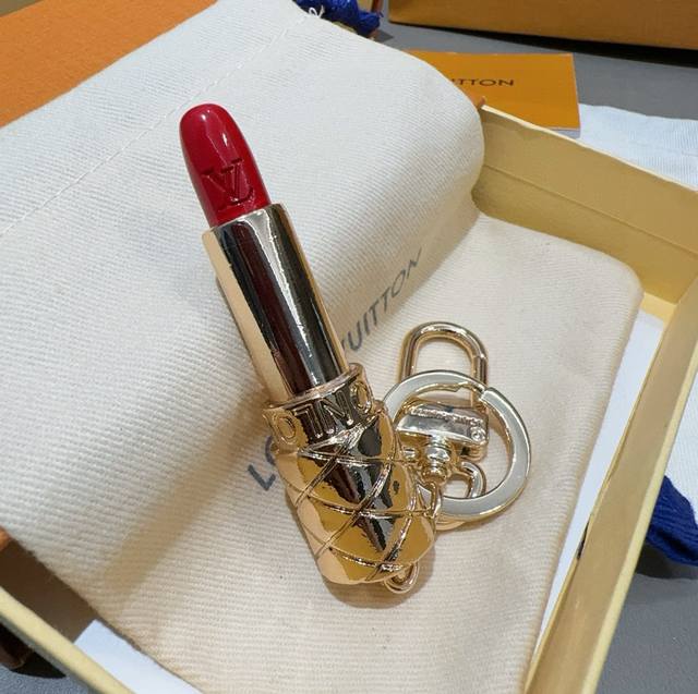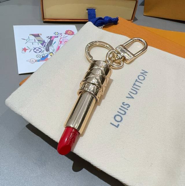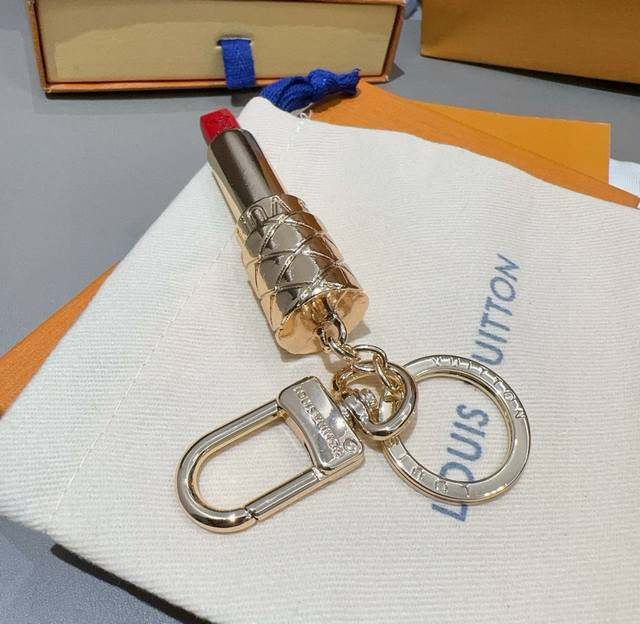 Louis Vuitton (LV) Lipstick Bag Charm, LV Keychain, Bag Pendant, Accessory. The LV Lipstick bag charm embodies the creative essence of Artistic Director Nicolas Ghesquiere, reflecting the brand's relentless pursuit of fashion and elegance. The metal is cleverly crafted into a lipstick tube shape, while the resin tip adds a touch of vibrancy, injecting a modern flair into handbags or keychains.