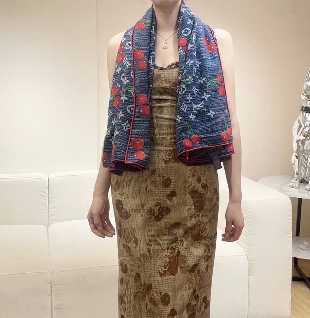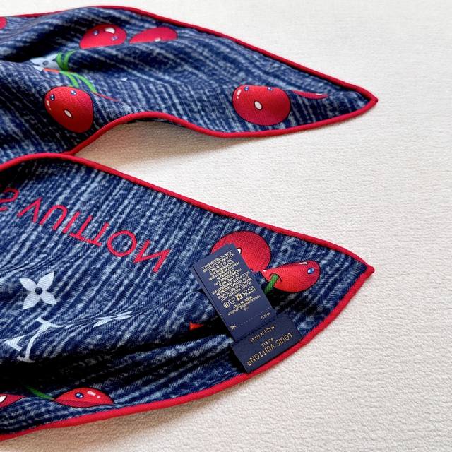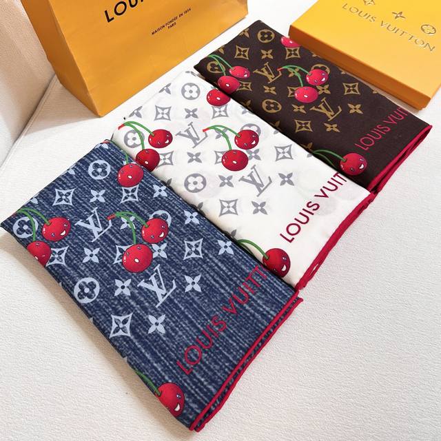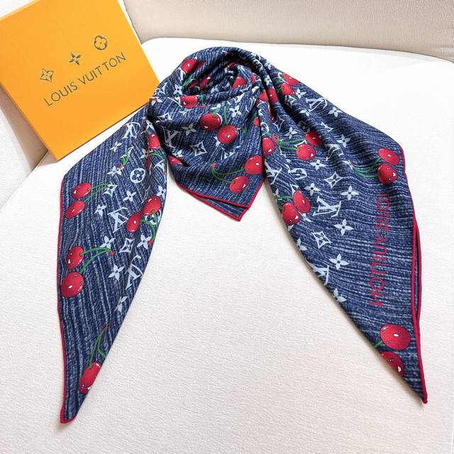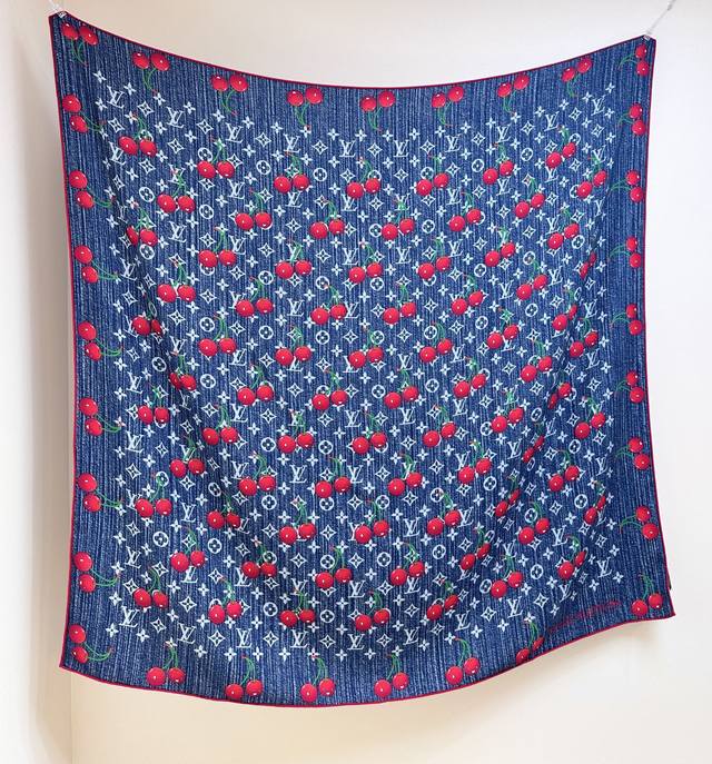 Louis Vuitton x Tm Monogram Cerise 140 Silk and Wool Handkerchief. This Louis Vuitton x Tm Monogram Cerise handkerchief is from the Louis Vuitton x Takashi Murakami reissue collection. It features a Monogram pattern embellished with luxurious silk and wool, infused with a fresh and vibrant feel by the lively cherry motif from a Japanese artist. Whether worn alone or paired with other items from the collection, it exudes a striking style. Dimensions: 135*135 cm (Length x Height). 30% Silk, 70% Wool. Inkjet printed Monogram pattern, cherry blossom pattern, Louis Vuitton logo .