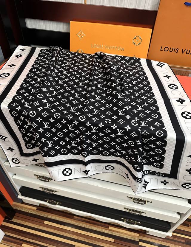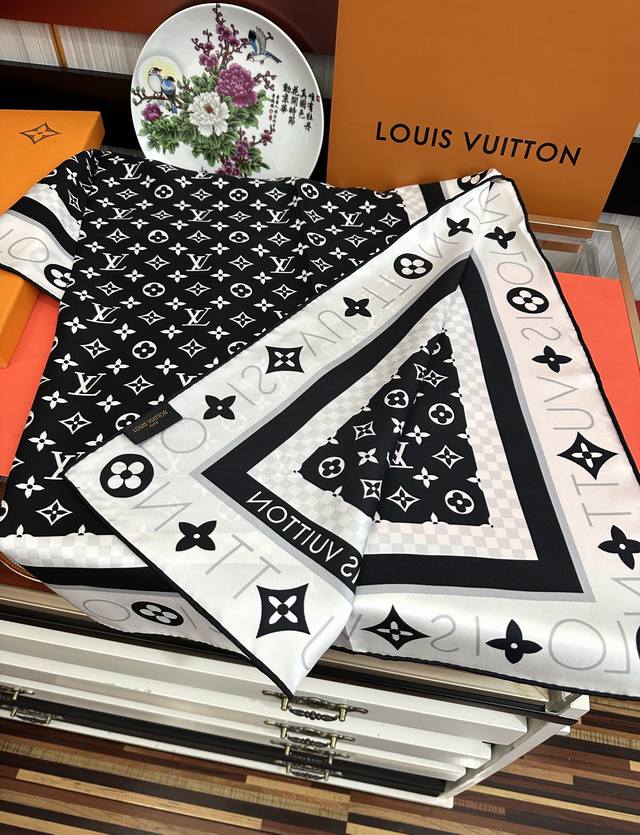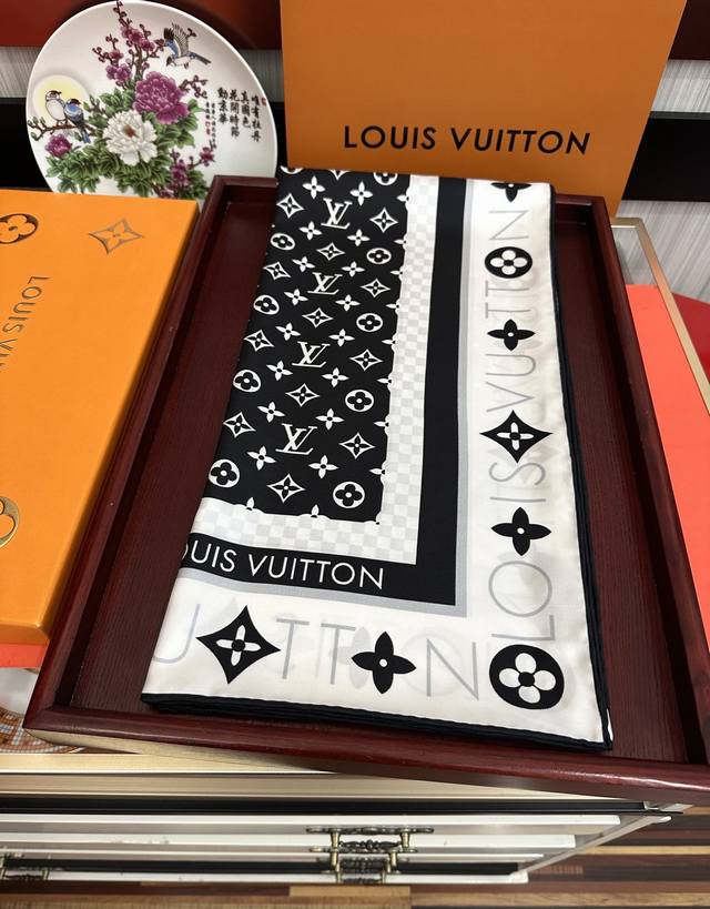 Lv 25 Official website synchronized, double-sided, same color, looks good no matter how you wear it, so beautiful! Top-notch design, perfect for summer, looks good no matter how you wear it. This square scarf is from the collaboration between Louis and Takashi Murakami. It features a Monogram pattern on a soft mulberry silk background [lips], with lively floral edges paying homage to the artist's "ultra-flat" style. The square shape and wide size are suitable for creating various styles. Size: 90X90, Material: 18 momme top-grade silk.