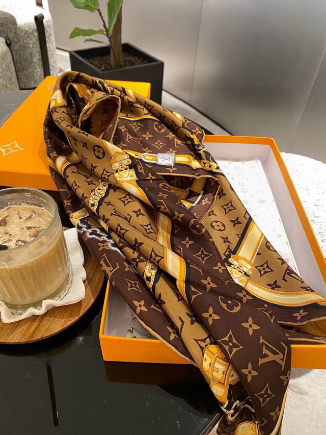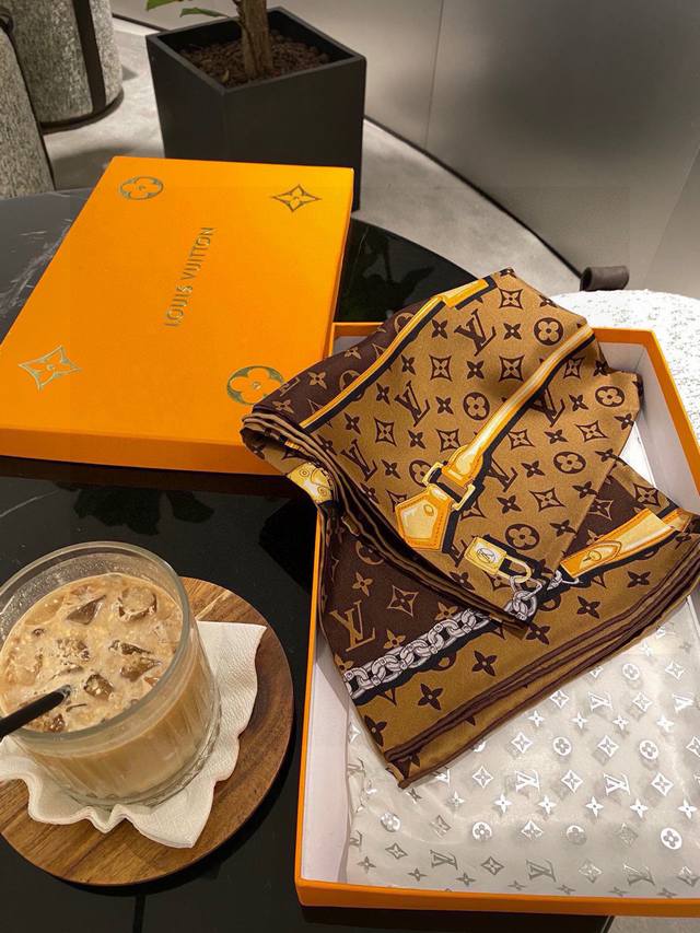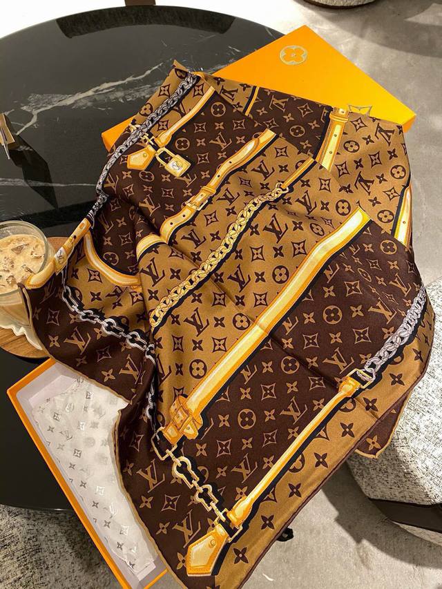 LV Chain Flower. LV2025 boutique style, 90*90 16 momme premium silk square scarf, 2 colors, in stock. A must-have item for spring and autumn in air-conditioned rooms! .