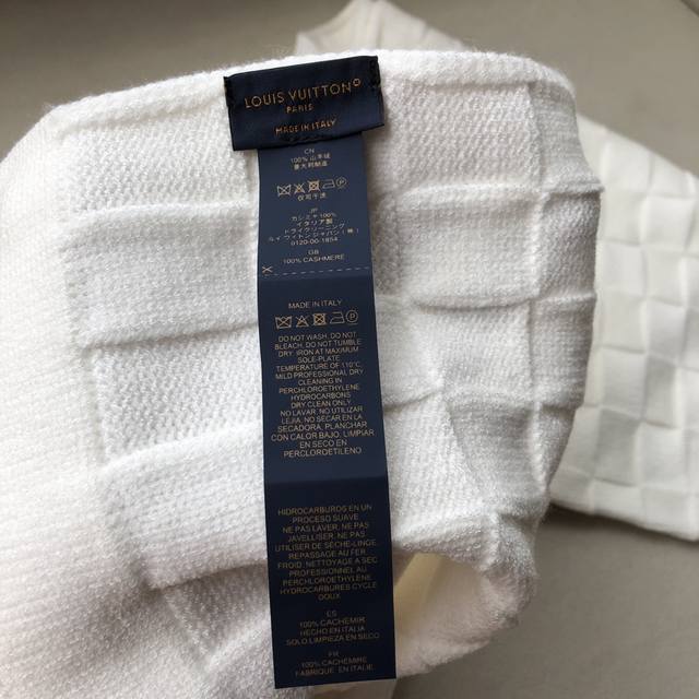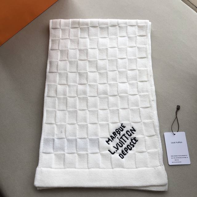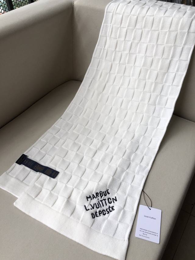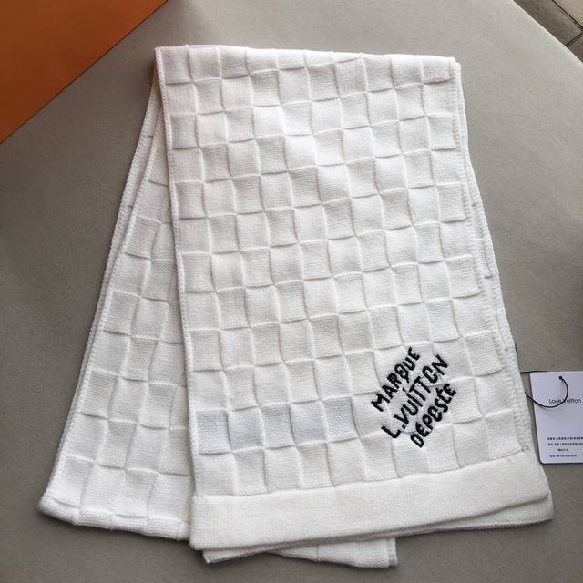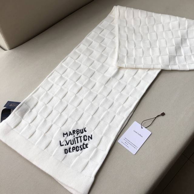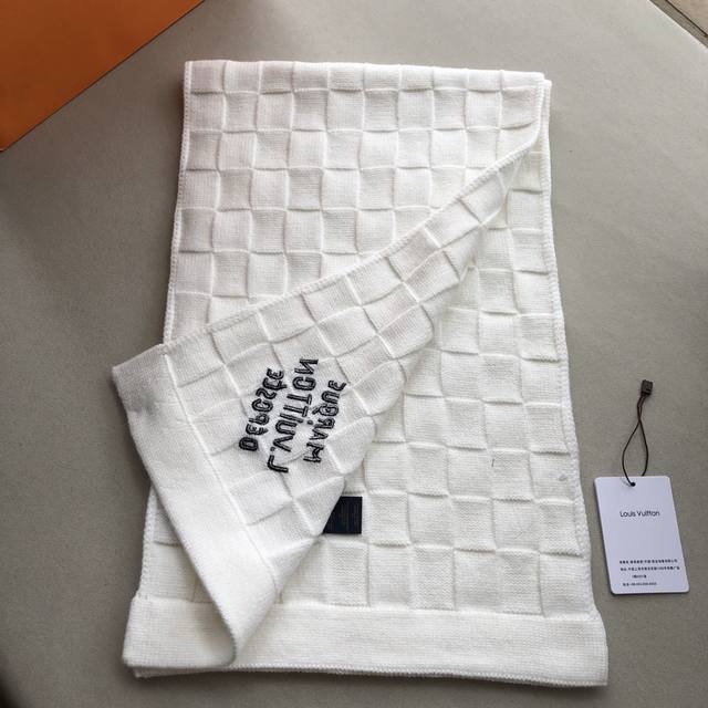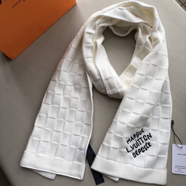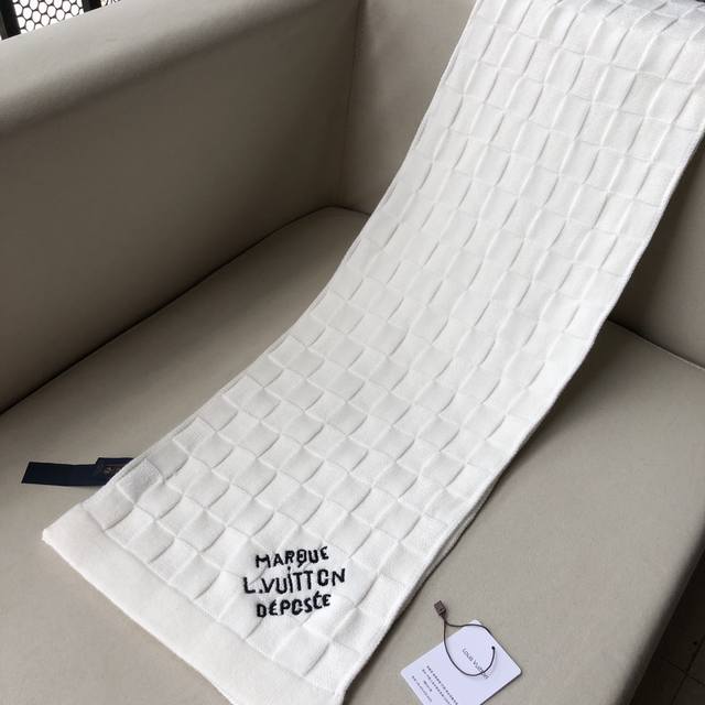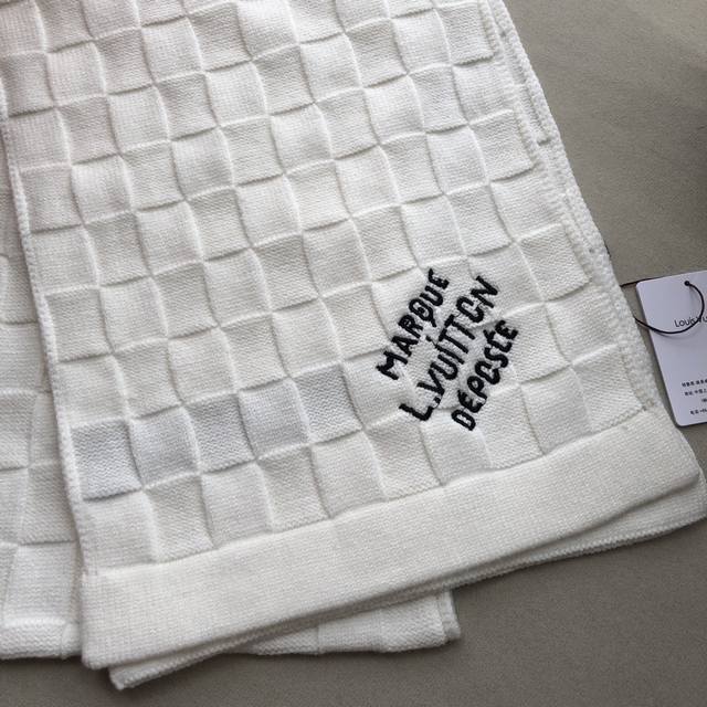 Fluffygram scarf is made from a blend of sheep wool and alpaca wool, knitted to create a cozy and warm feeling. The handwritten Louis Vuitton logo adds a touch of trendy style to your everyday look. Jacquard pattern, Louis Vuitton logo pattern,